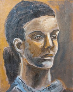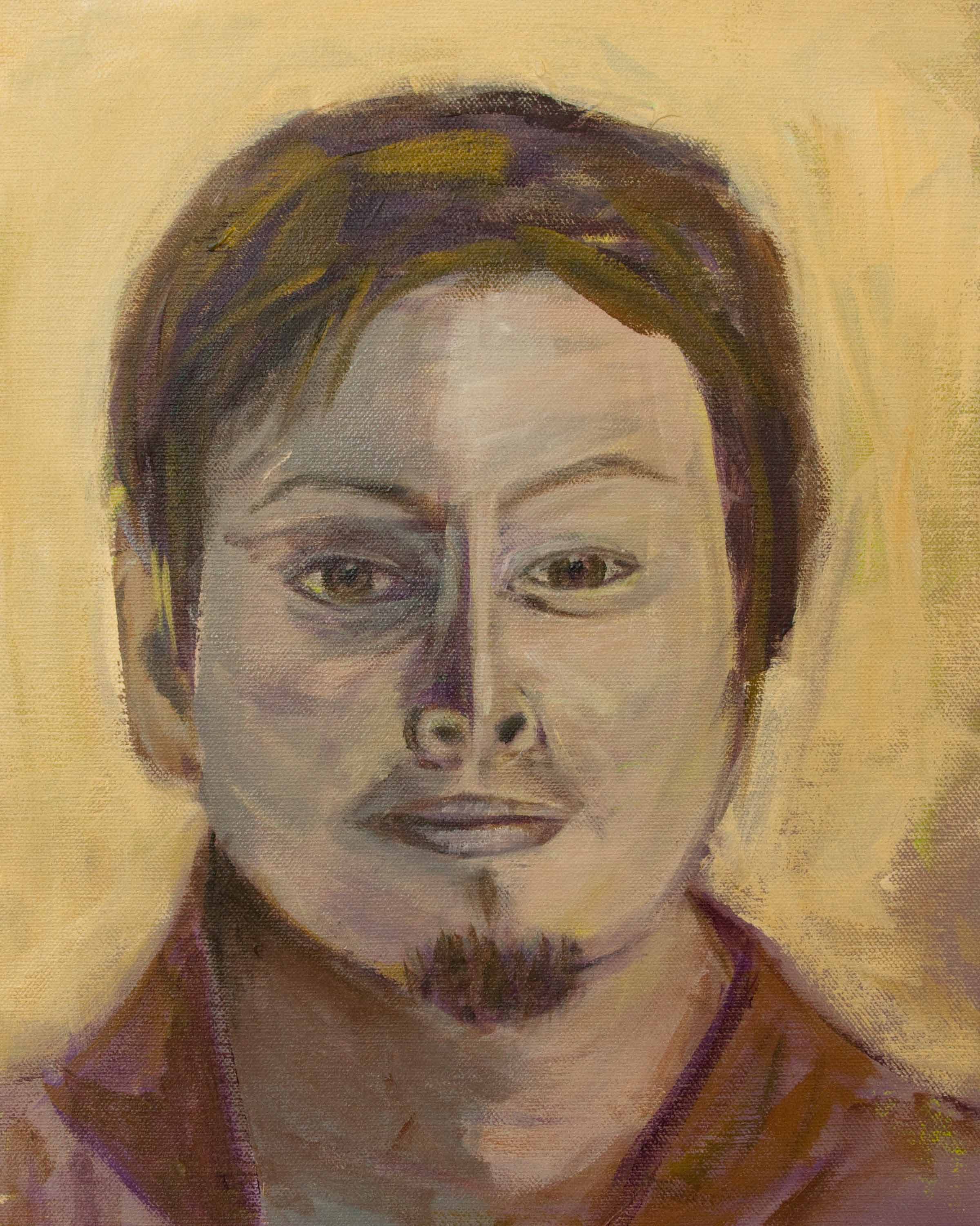 Last week’s in-class portrait. Limited palette again, mostly mixtures of yellow and violet. Tried to maintain a sketchy quality.
