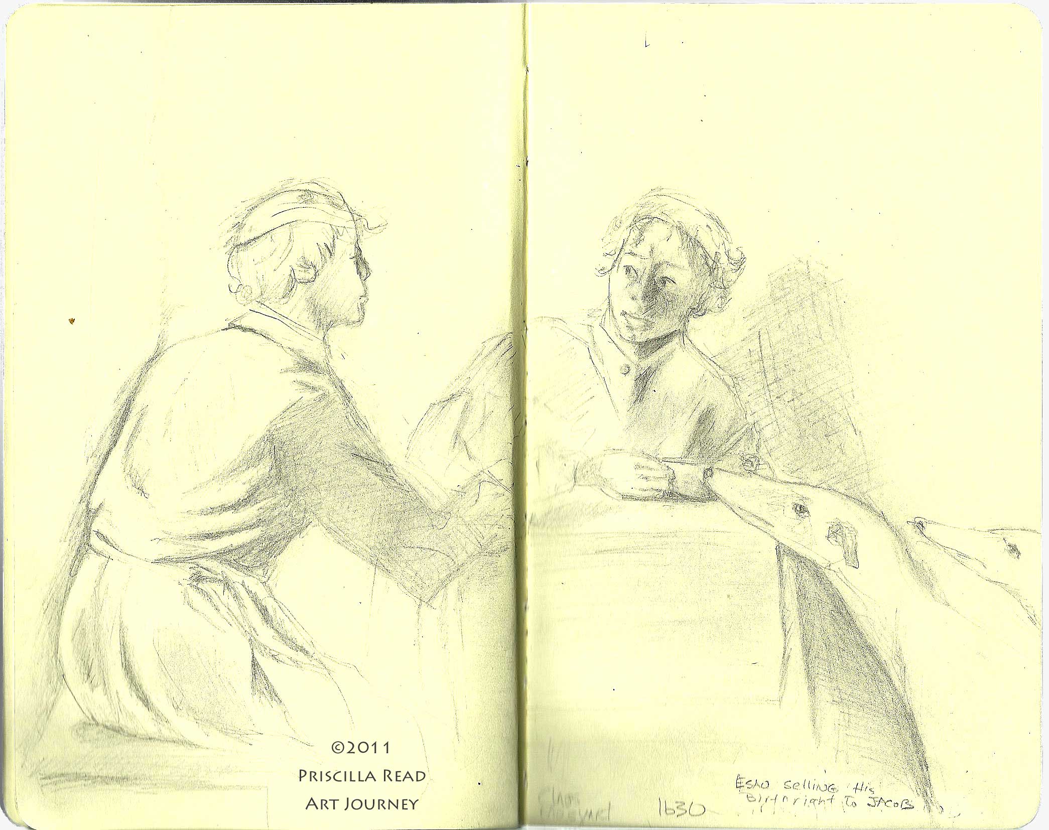 I went right away to the current exhibition of Dutch and Flemish Masterworks The paintings are so rich in detail that it was difficult to decide what to draw. I chose a1630 painting by Claes Moeyard, Esau Selling His Birthright to Jacob because of the composition and theatrical lighting. A docent tour was underway, but by the time the came over to the area where I was sitting, I was settled into the drawing process enough so their presence didn’t bother me.