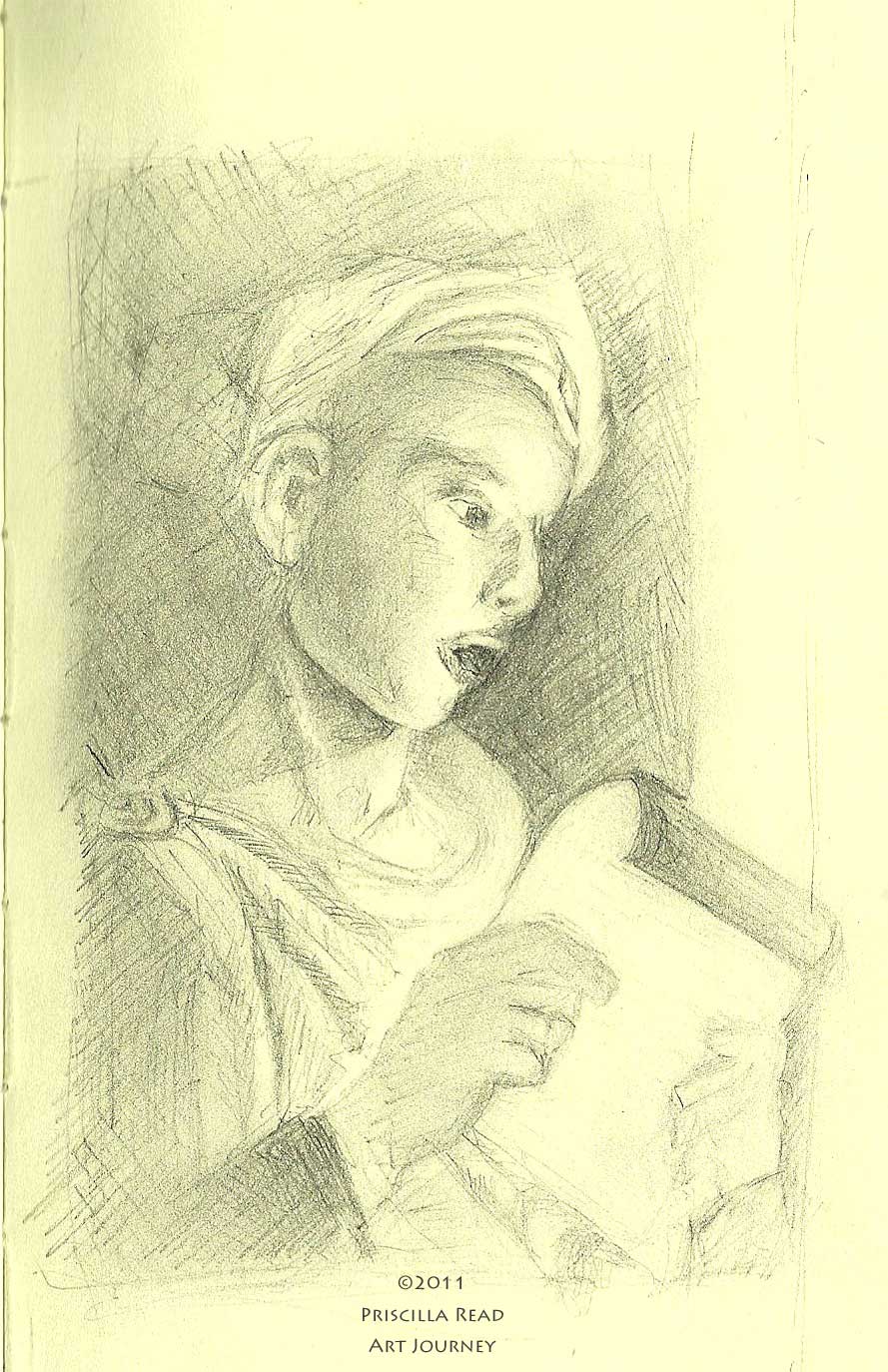 By the time I finished the drawing, the galleries were getting pretty crowded, so I decided to go upstairs t0 the permanent collection and find something else to draw. I found this French painting from ~ 1620-1640 by Trophime Bigot aka The Candlelight Master -Le Jeune Chanteur (Young Boy Singing). This painting is dramatically lit from below with the figure mostly in darkness and the face and music manuscript glowing in the candlelight.