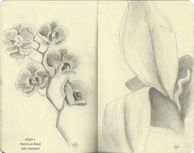 I’ve been sketching just about everyday for the Sketchbook Challenge. The latest sketches are of some orchids I got over at the farmers market for $8. They’re such a joy to look at, so I thought I should try drawing them. The flowers have intricate detail and great subtlety, so how do you draw them? Here’s what I came up with. First determine the general shape and orientation of the parts with relationship to each other. Then simplify the shapes to give the impression of detail without actually trying to draw in every last thing. After all, it is a drawing, not a photograph.