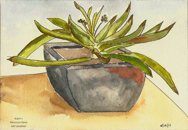 I’ve continued with the sketchbook pages of everyday objects and am now adding watercolor to the sketchbook drawings. I’m taking an online class with Jane LaFazzio whose work I love. A major objective of the class Sketching & Watercolor: Journal Style: ON LOCATION, is to go to places like the local coffee shop, a museum, aquarium or zoo and create watercolor pages live, “on location”. For the first week, we’re just warming up – getting used to a new medium and techniques at home – and next week well head out with our travel kits. Here are a couple of my first watercolor drawings: