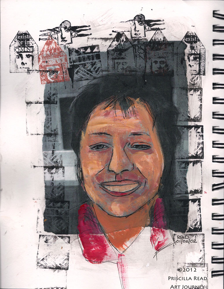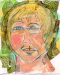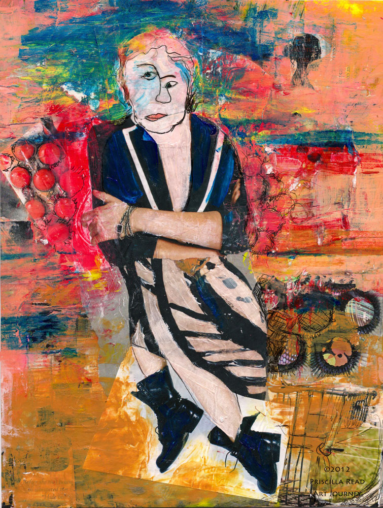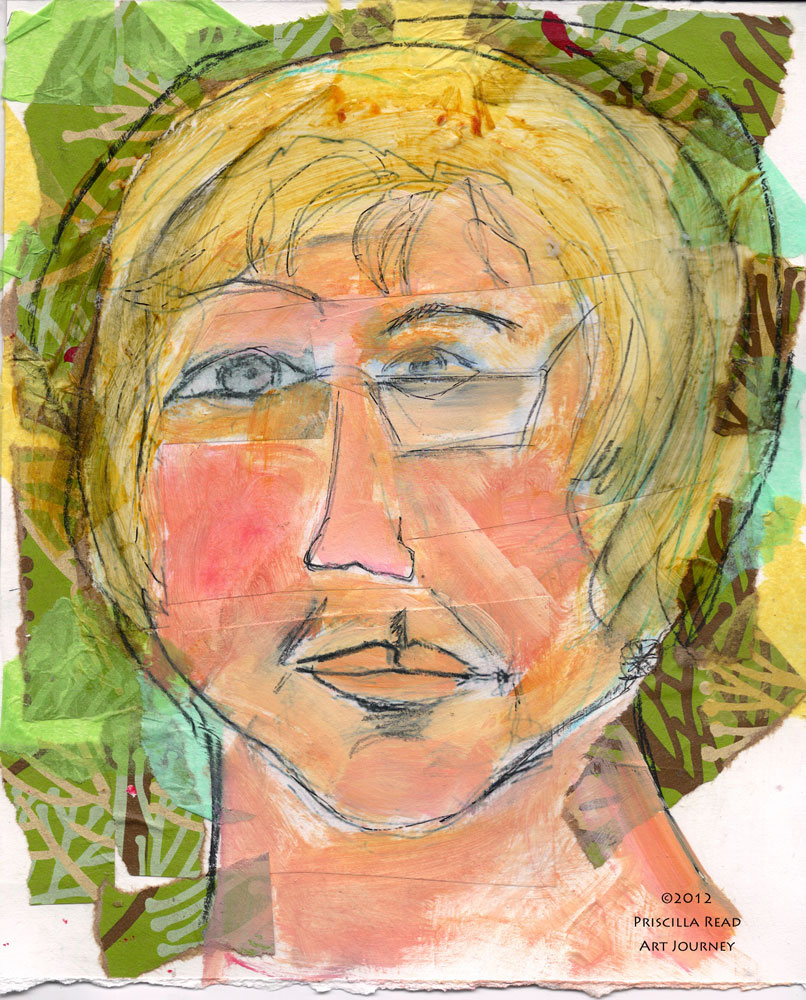 Over the last 6 weeks, I’ve been taking an online class with Jane Davies, Exploring the Self  Portrait.  One of the greatest challenges for me was to quit worrying about how I could never get the portrait to look like me and to let myself explore the techniques and concept of the self portrait.  Here are a sampling of portraits done over the course of the class.  Techniques include drawing, painting, collage.