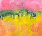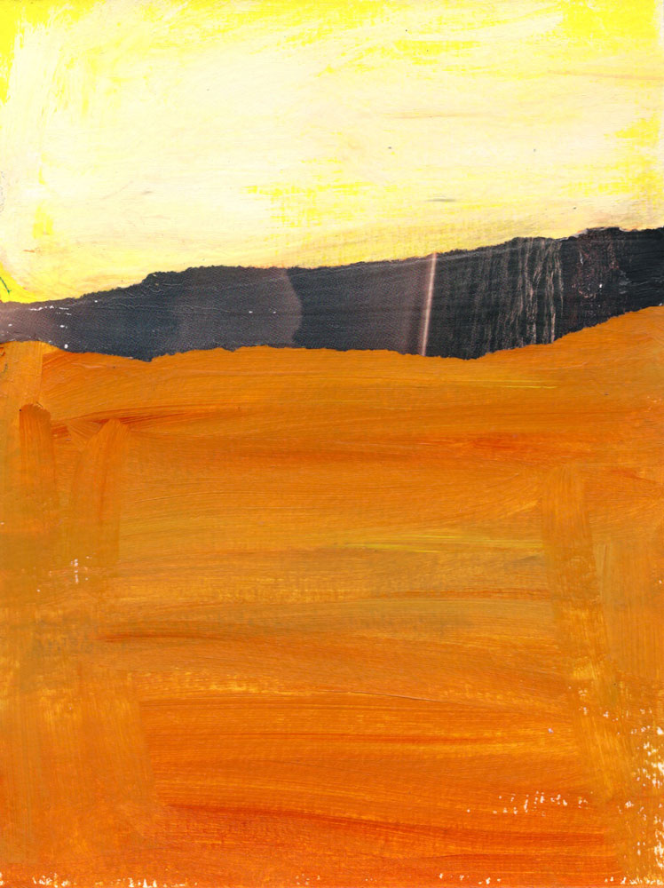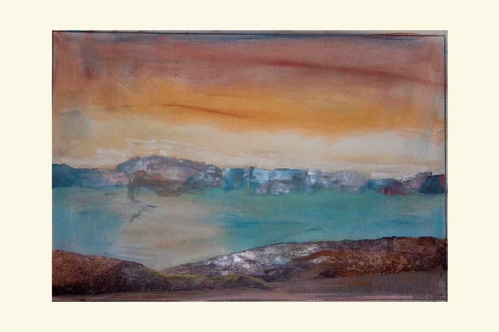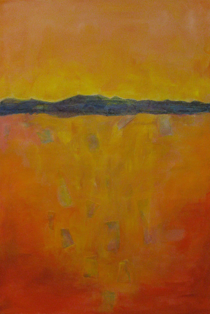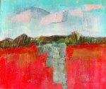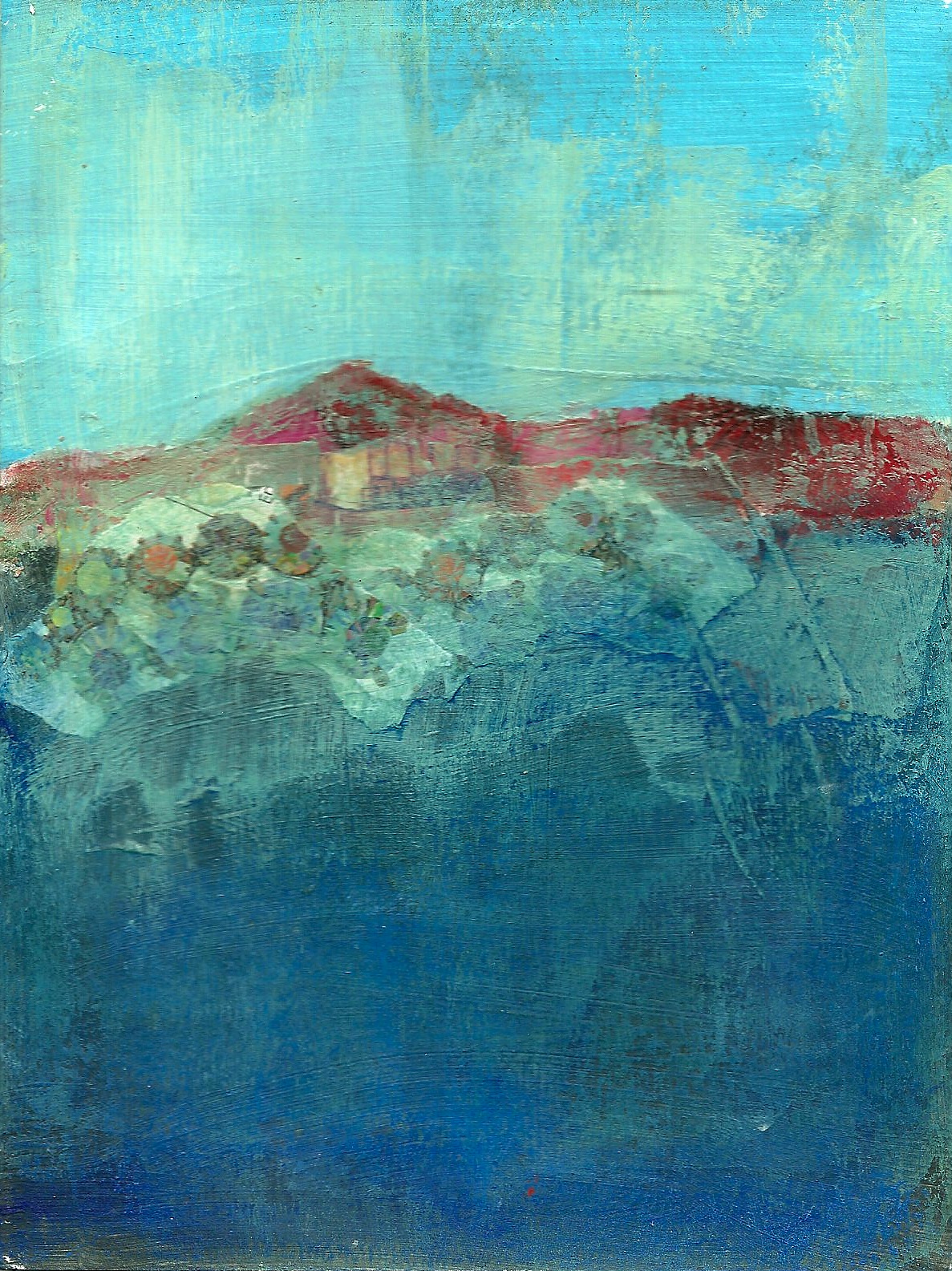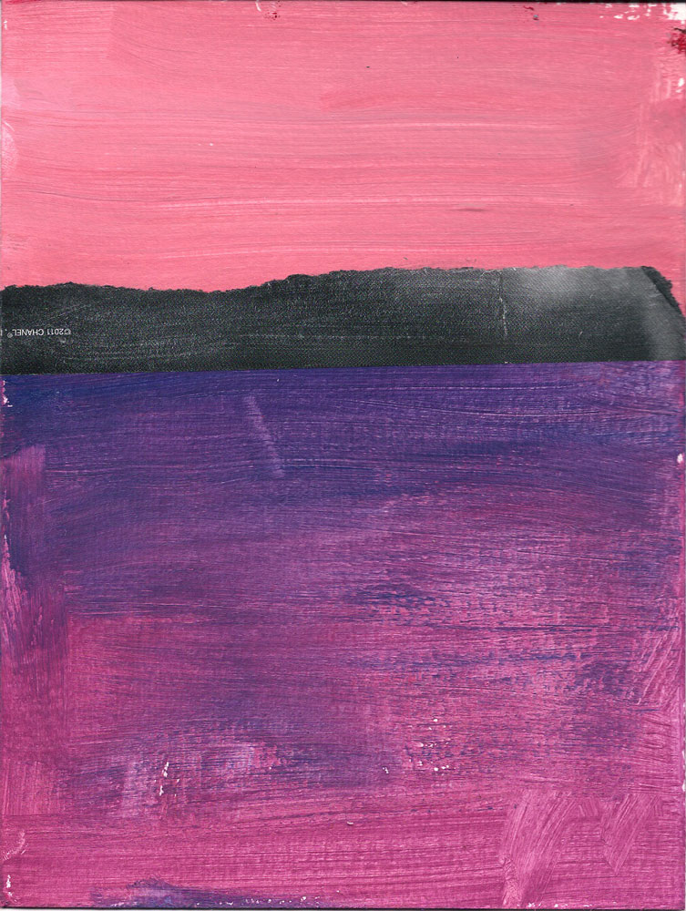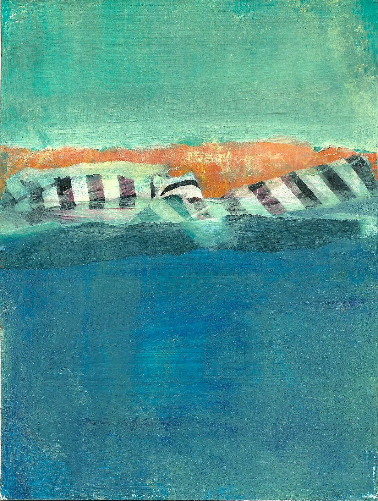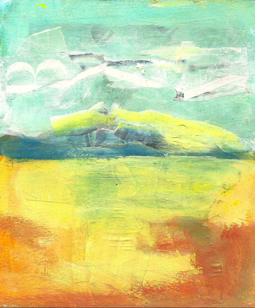 For the past month or so, I’ve been exploring ways to show horizon lines in paintings and drawings using collage elements on the horizon line.  I started playing with this in Jane Davies’ online workshop Keys to Dynamic Composition.  I started by making sketches from the view out my window, then sketches inspired by Van Gogh paintings, looking at the way the sky meets the horizon in his compositions.  I continued by making some simple collage studies with magazine papers for the horizon and one color above and another below the horizon line.  After making a few of those, I continued making collages along the same line, but adding more collage elements above and below the horizon line and using acrylic paint or soft pastels to integrate the collage into the composition.   Most are  8″ x 10 ” or less in size.