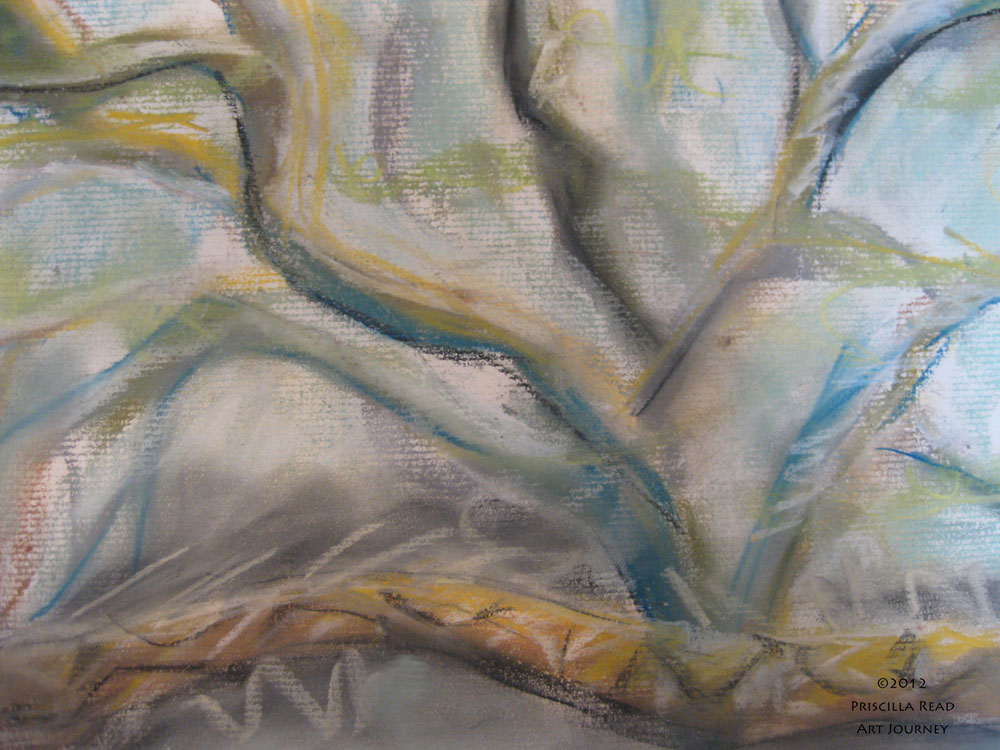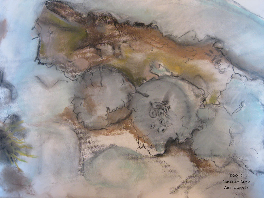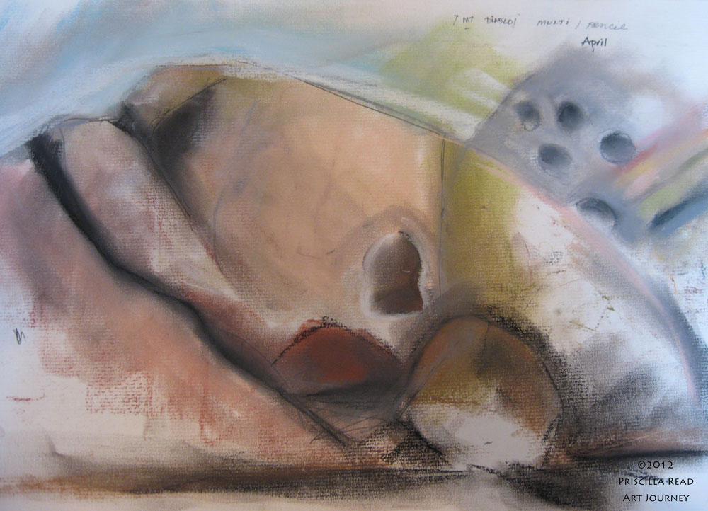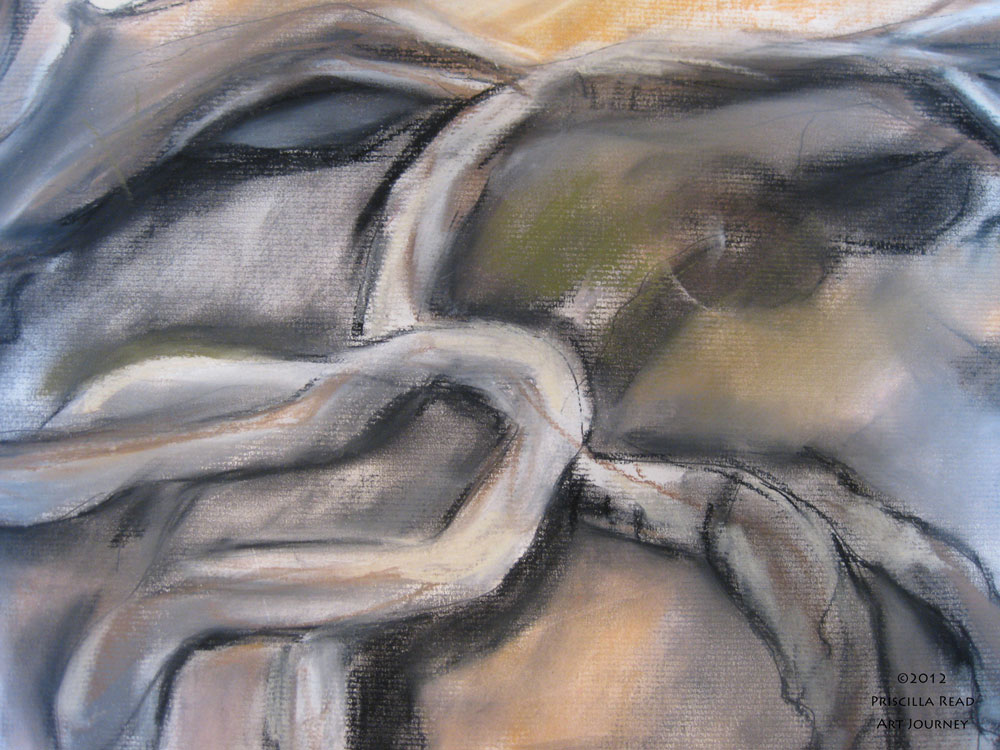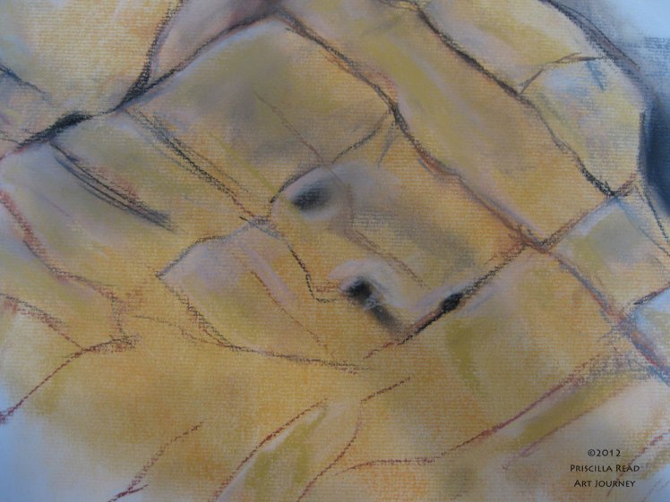 Our final project for The Abstract in Nature is to create a multi-panel painting (at least 2 canvases) showing the essence of a location in nature that we visited several times.  Yesterday I revisited Mt Diablo and spent an afternoon sketching with ink and pastel looking at shapes and forms that were repeated large and small scale in the rocks and trees. Here are my sketches: Rock city crevices