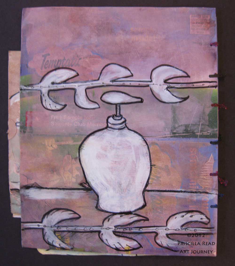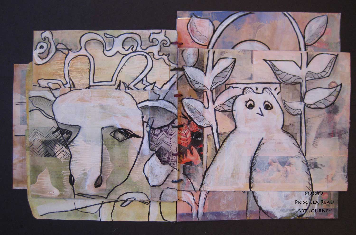 Yesterday I completed my Junk Mail Secret Diary and had enough left over gessoed and painted junk mail pages available to make a second book. I continued with the same process I learned in Carla Sonheim’s Junk Mail Artist’s Book class using my imagination to create drawings that overlapped onto the next page. When the page is turned, parts of the previous drawing ideally become something new, different, and surprising.