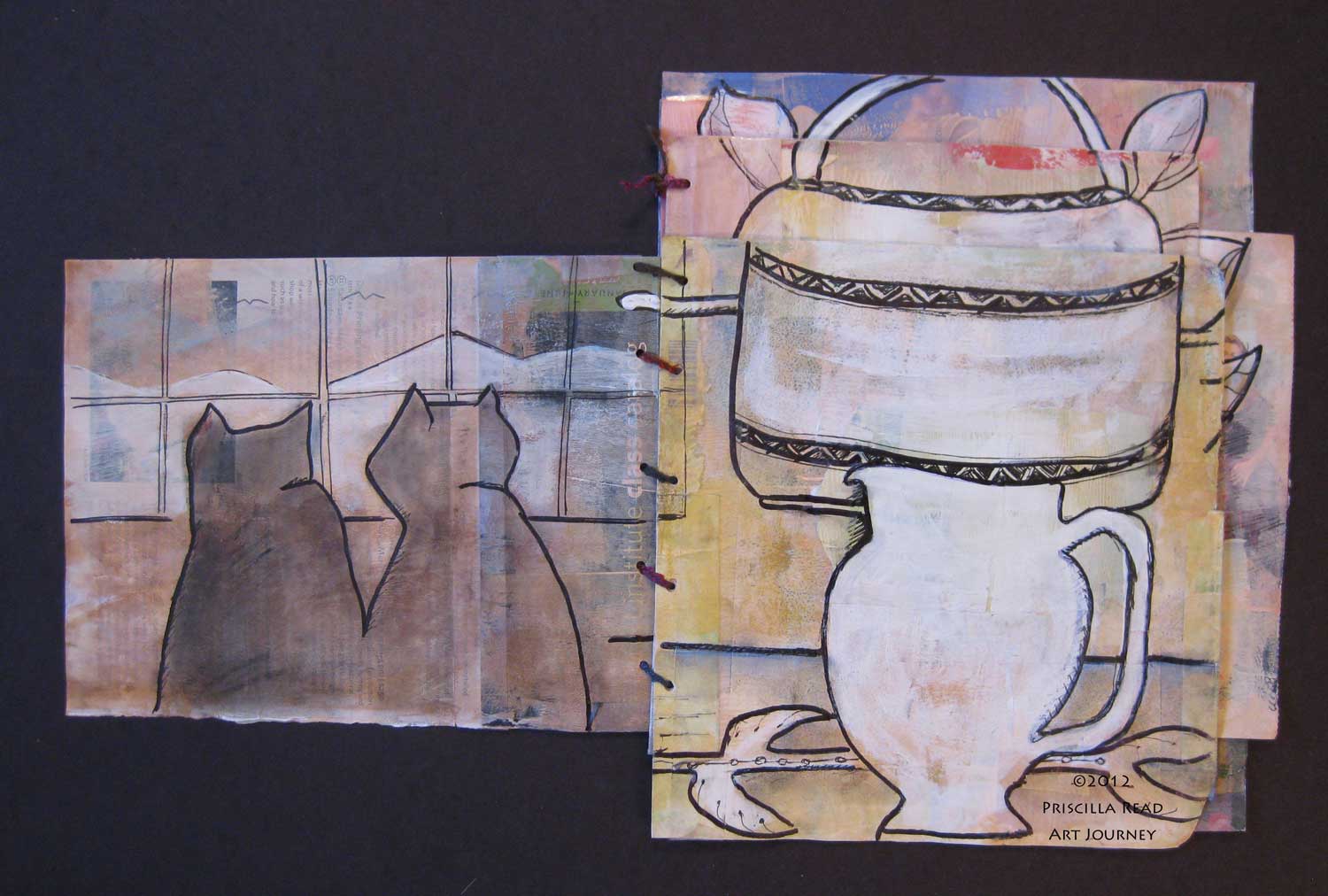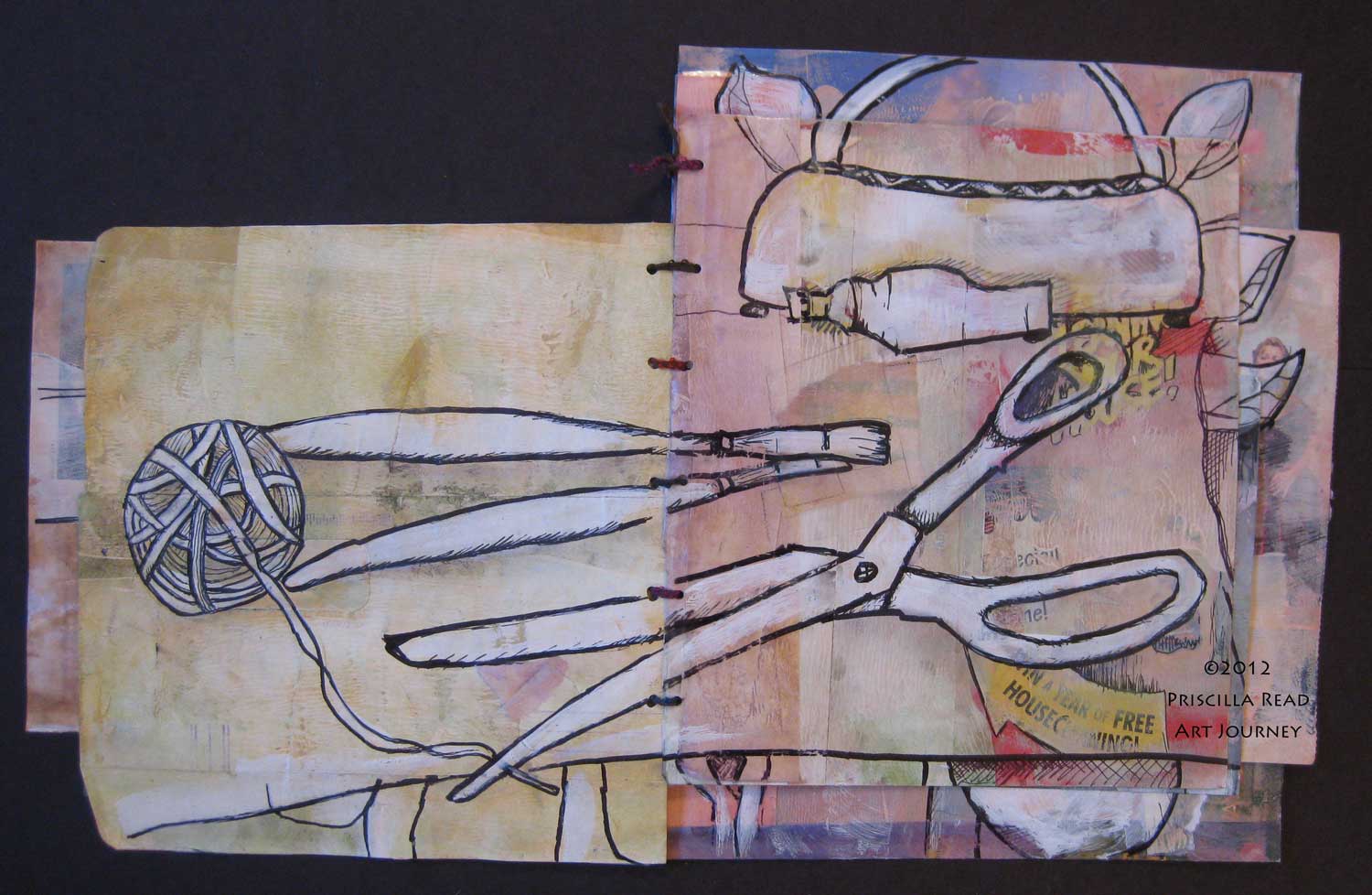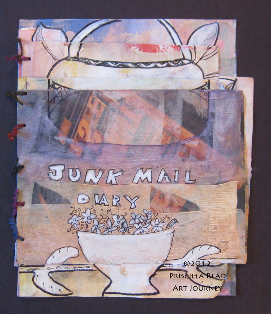 I enjoy this process and want to explore it further. With a bit more planning and care, the books could be even more amazing. I love the idea that the junk mail is a free source of material that I could use in many ways, including collage. Meanwhile, I’m collecting more junk mail for another round of painting and drawing.