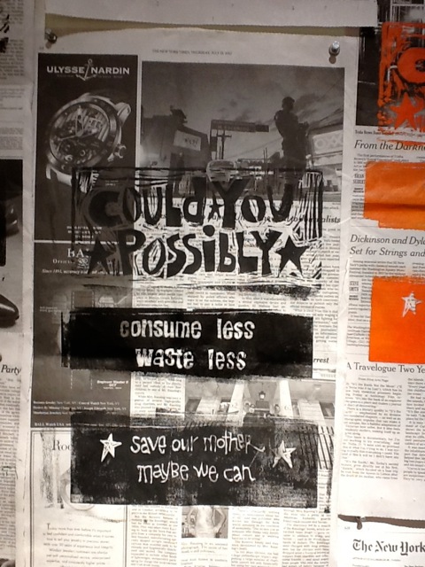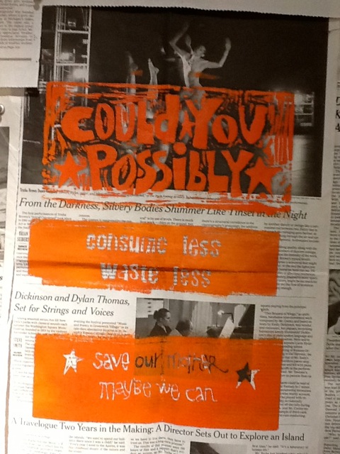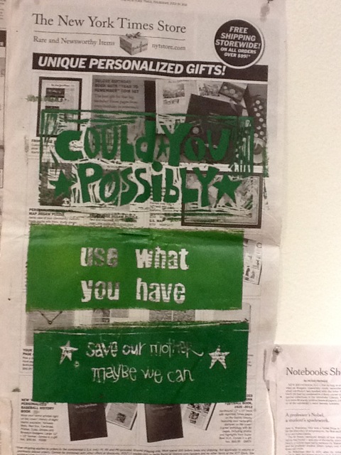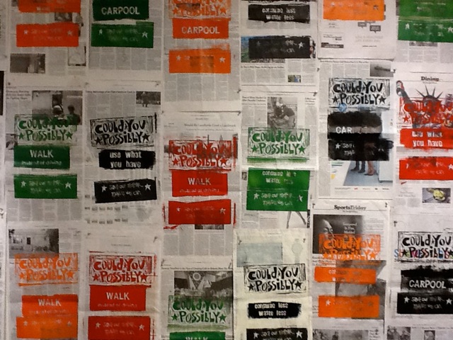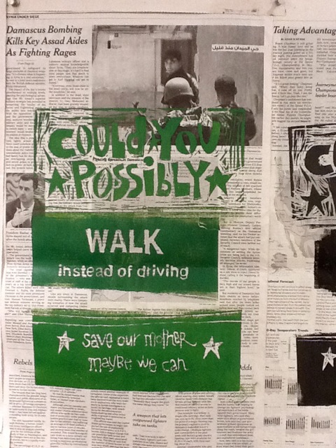 A fellow student Susan Richardson in the UC Berkeley Extension class “Printmaking and Street Art as Activist Tools” tackled the issue of global warming in her first project by asking “Could you Possibly”. She created a series of linocuts printed on newspaper. Each of the prints has the text “Could You Possibly” at the top and “Save Our Mother – Maybe we Can” at the bottom. In between these words she poses a different suggestion, such as “Walk instead of Driving”, “Consume Less Waste Less”, and “Carpool”, on each print. Like so many of the issues we discuss in class, global warming is huge. How do you say something about it without just being depressing? We talked about ways to raise awareness or show that the actions of individuals can make an impact for positive change. I love how Susan approached the question with this series – her work draws your attention and makes you think.