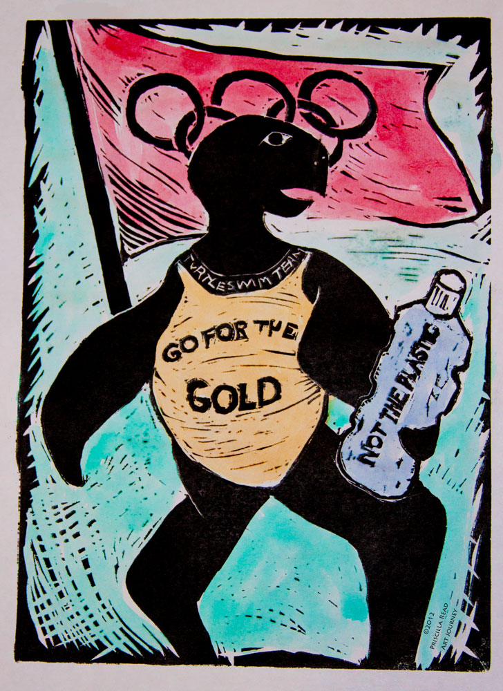 Continuing with “Printmaking and Street Art as Activist Tools” my next assignment was to create a linocut about the plastic problem and make it available online as a pdf. The hawksbill turtles swim thousands of miles in their annual migration, so the idea of depicting them as olympic swimmers made sense to me. After making a few sketches, the idea came together in a way that seemed both attention grabbing and humorous. I printed the 8 1/2″ x 11″ linocut and hand colored it with watercolor.