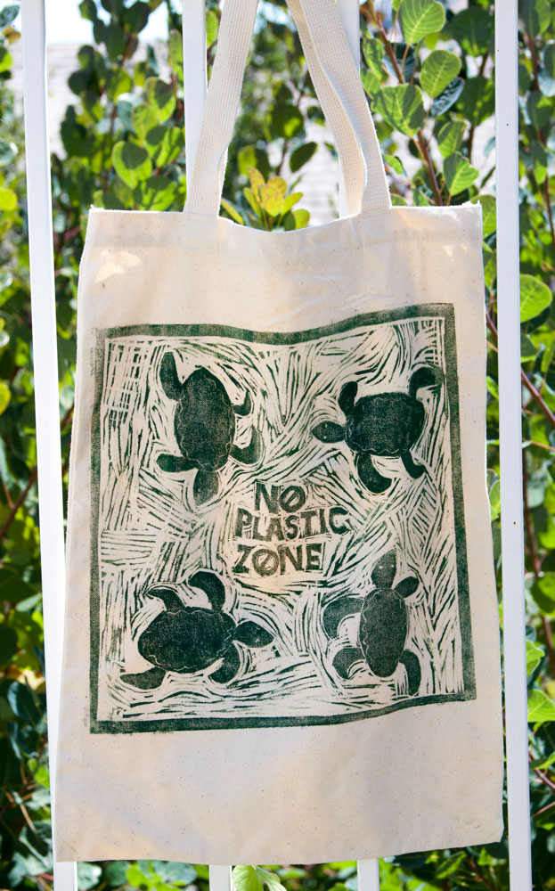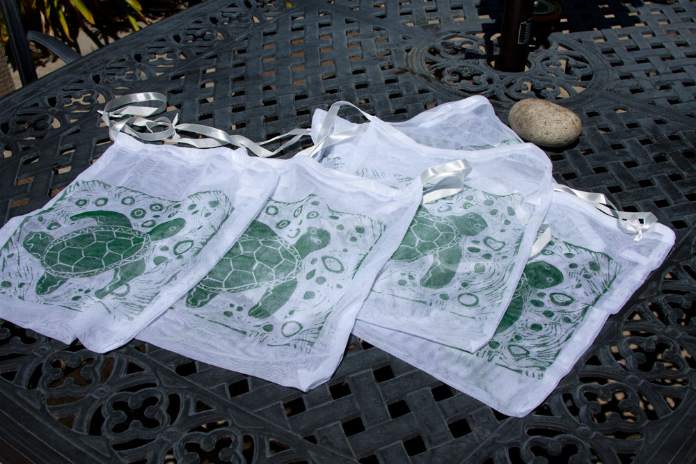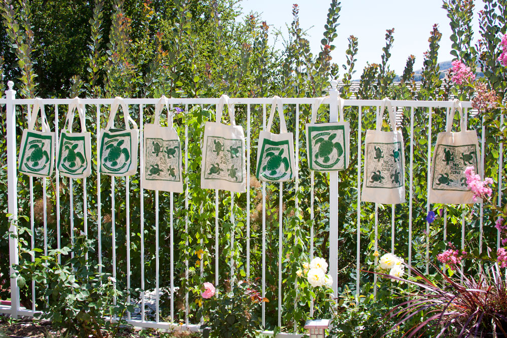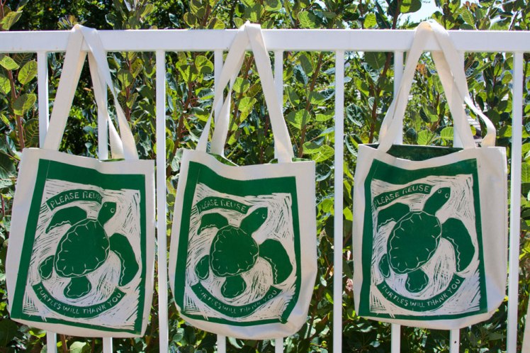 Our final assignment in the UC Berkley Extension class “Printmaking and Street Art as Activist Tools” was to create a series of three related linocuts, printing each with an edition of five. I decided to continue with my turtle theme to highlight the plastic problem and create a set of shopping bags. I started by printing canvas with a turtle motif, then sewed each into fabric lined bags using an easy free pattern from Skip to My Lou.