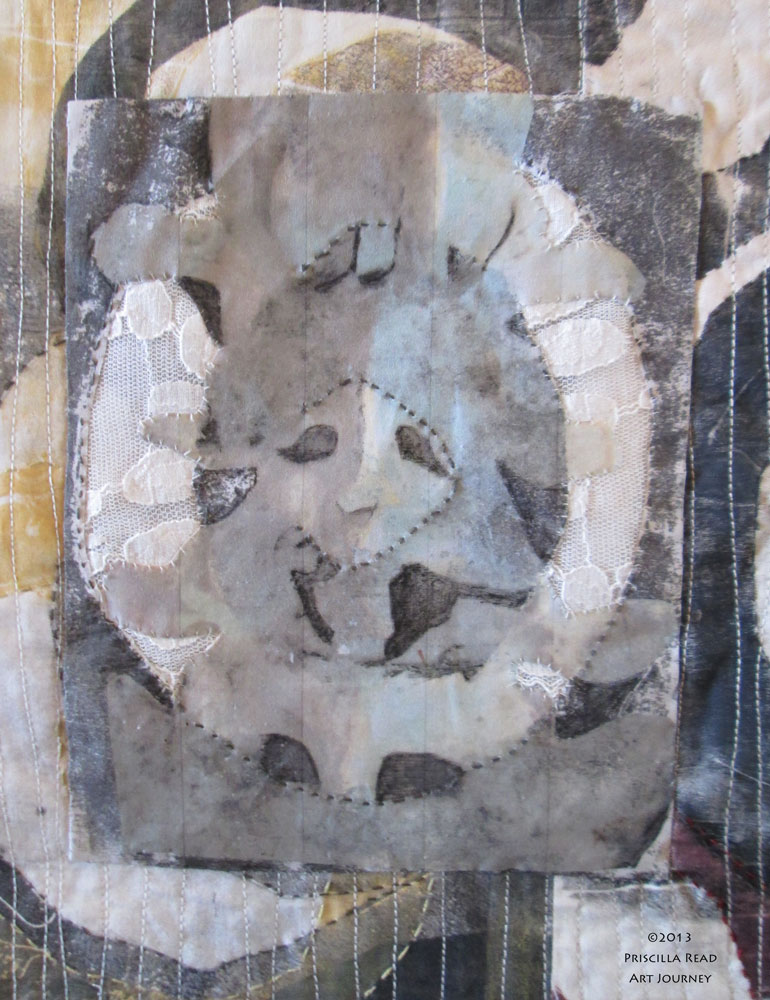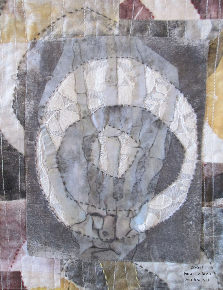 Continuing with my circle series, I patched together fabric monoprinted with my circle motif, then added hand stitched running stitches around some of the circles and vertical lines of machine stitching. After looking at the composition I decided to print onto fabric some of the images I photographed from the skeleton at the Art and Design Center. I didn’t think there was enough contrast, so I added contrast with ink, appliquéd some lace behind some of the bones and added some hand stitching.