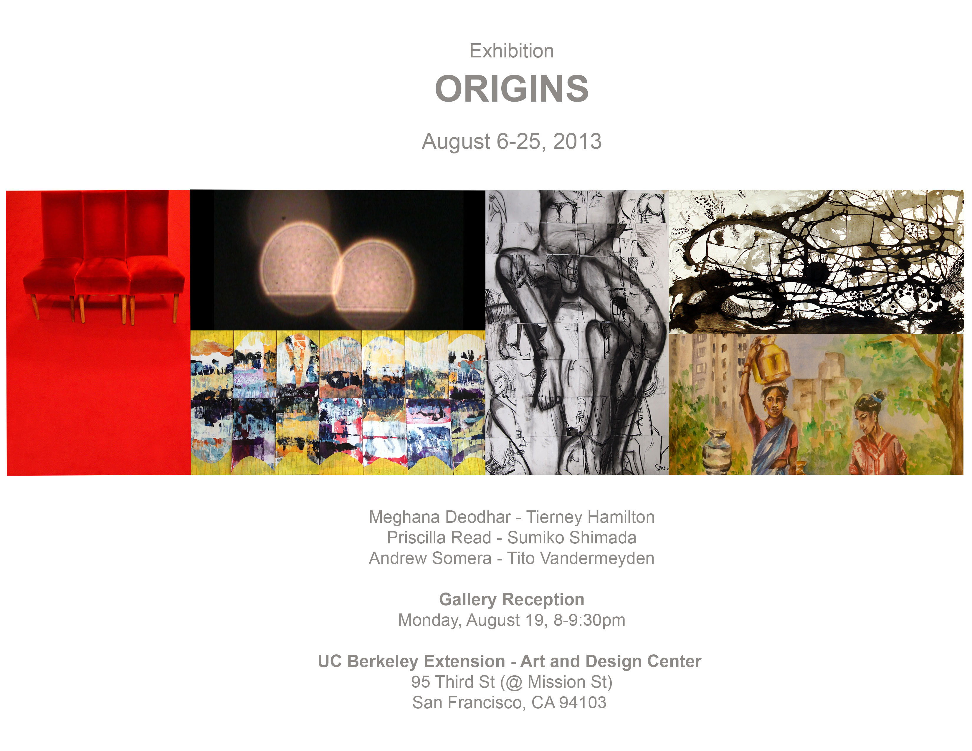 ORIGINS, a group show featuring 6 Post Baccalaureate Certificate candidates at UC Berkeley Extension will be on view from 8/6 through 8/25 in the upstairs gallery area.  Artists Reception Aug 19, 8 – 9:30 pm.