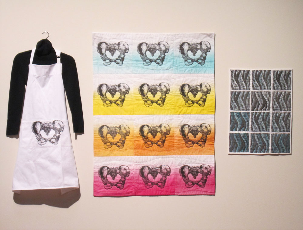 Here are the three linocut pieces I had in the show. Each was printed of fabric. On the left is Apron, linocut of a female pelvis printed onto a white apron. The middle piece, currently untitled, has the same pelvis printed with black ink onto 12 pieces of fabric, then overprinted with color, pieced together, then machine and hand quilted. And the third piece, Reaching, has 12 prints of abstract organic shapes, reaching towards each other, machine quilted.