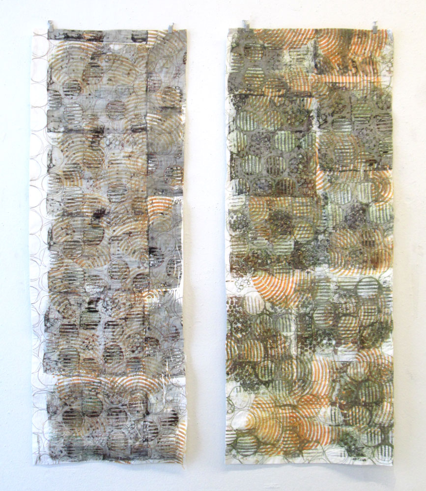In October I attended a two day workshop with Kerr Grabowski learning her deconstructed silk screen printing techniques. Her methods include creating designs and textures on fabric using thickened fiber reactive dyes, then printing the designs onto fabric. I created a good “stash” of fabric during the two days and some more when I got home, then spend some time considering how I could use the fabric in my current series, Life Forms. I created the following two pieces.