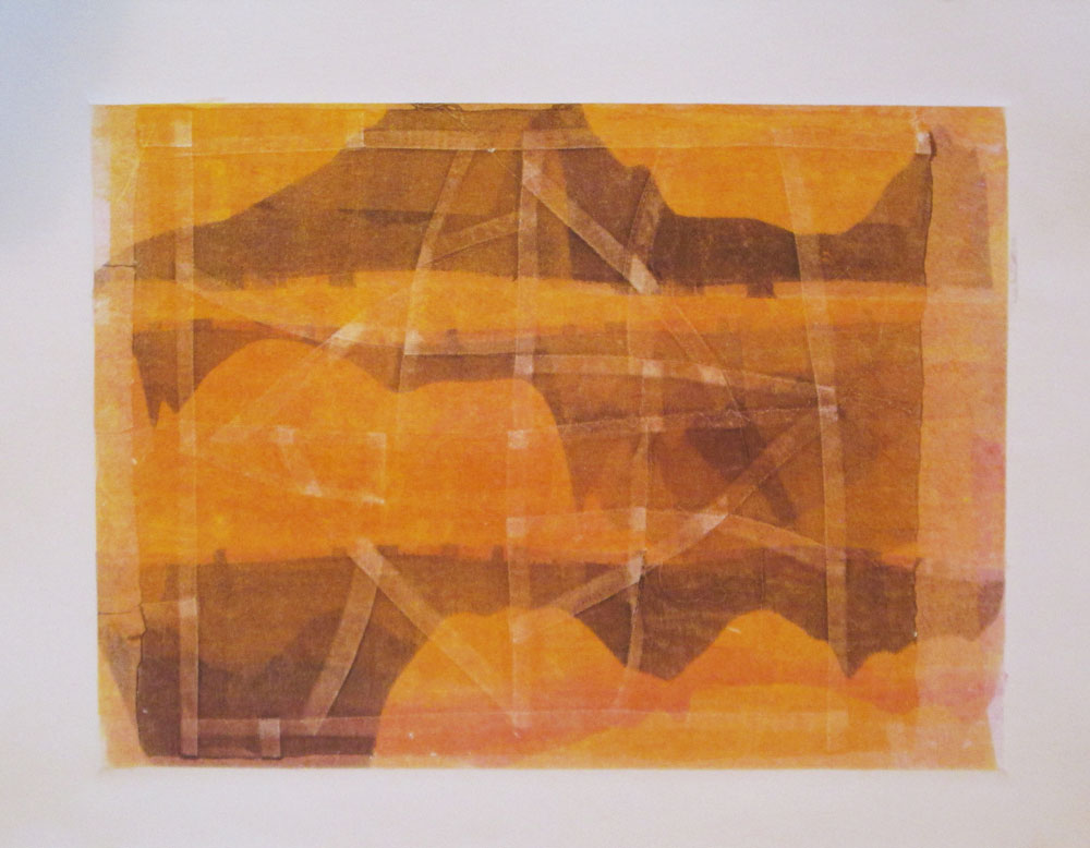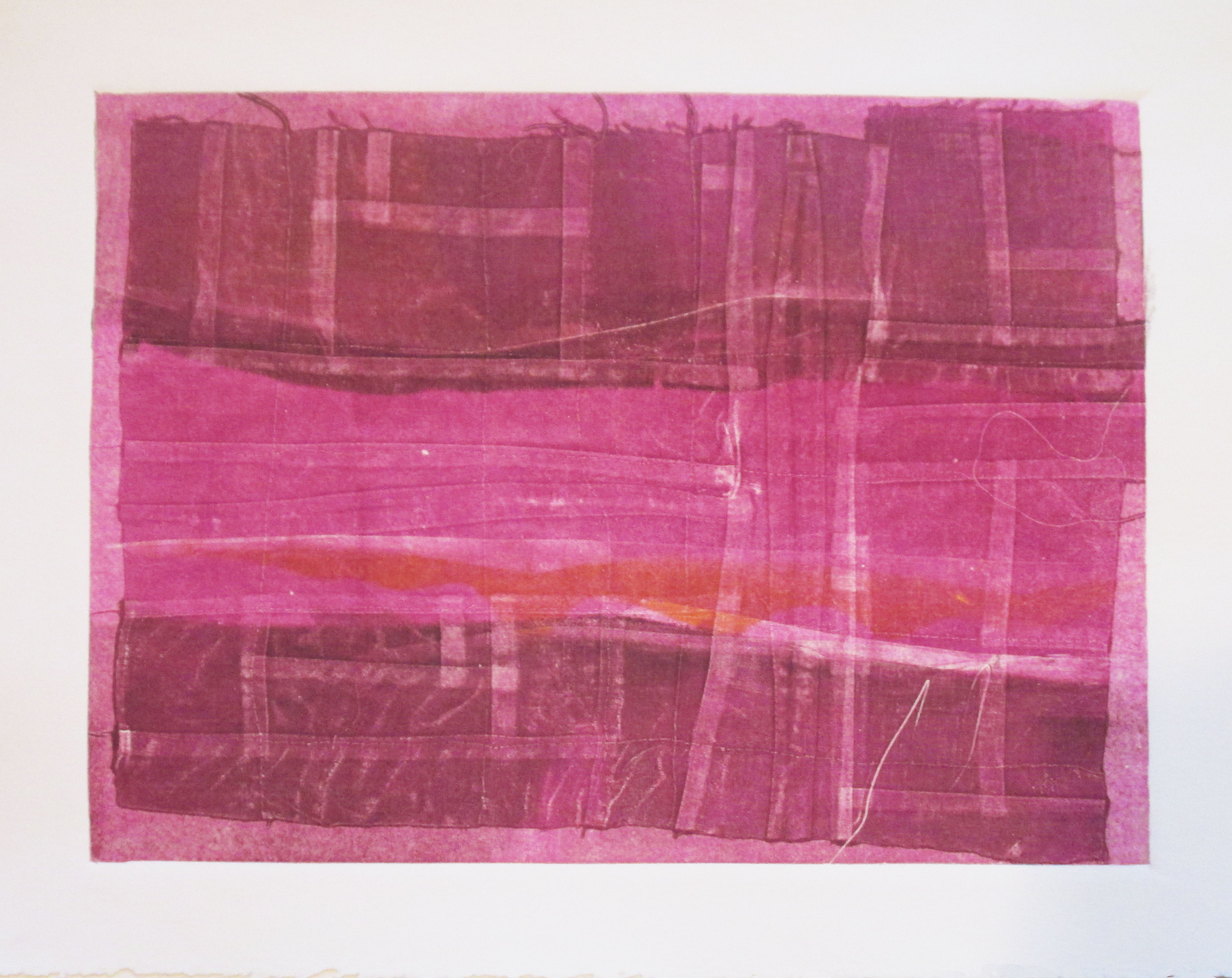 In Katie’s last monotype printing class for the year, I decided to continue experimenting with fabric to create texture and pattern in my monotype prints. I brought in some pieced and stitched or quilted fabric sitting around in my studio. My experiments started with inking up the plate with a few colors creating interesting shapes with the brayer, I placed the pieced fabric over the place, then put it through the press, so the texture of the fabric became imprinted into the ink on the plate. I printed the resulting plate onto paper. Here are a couple created using that technique: