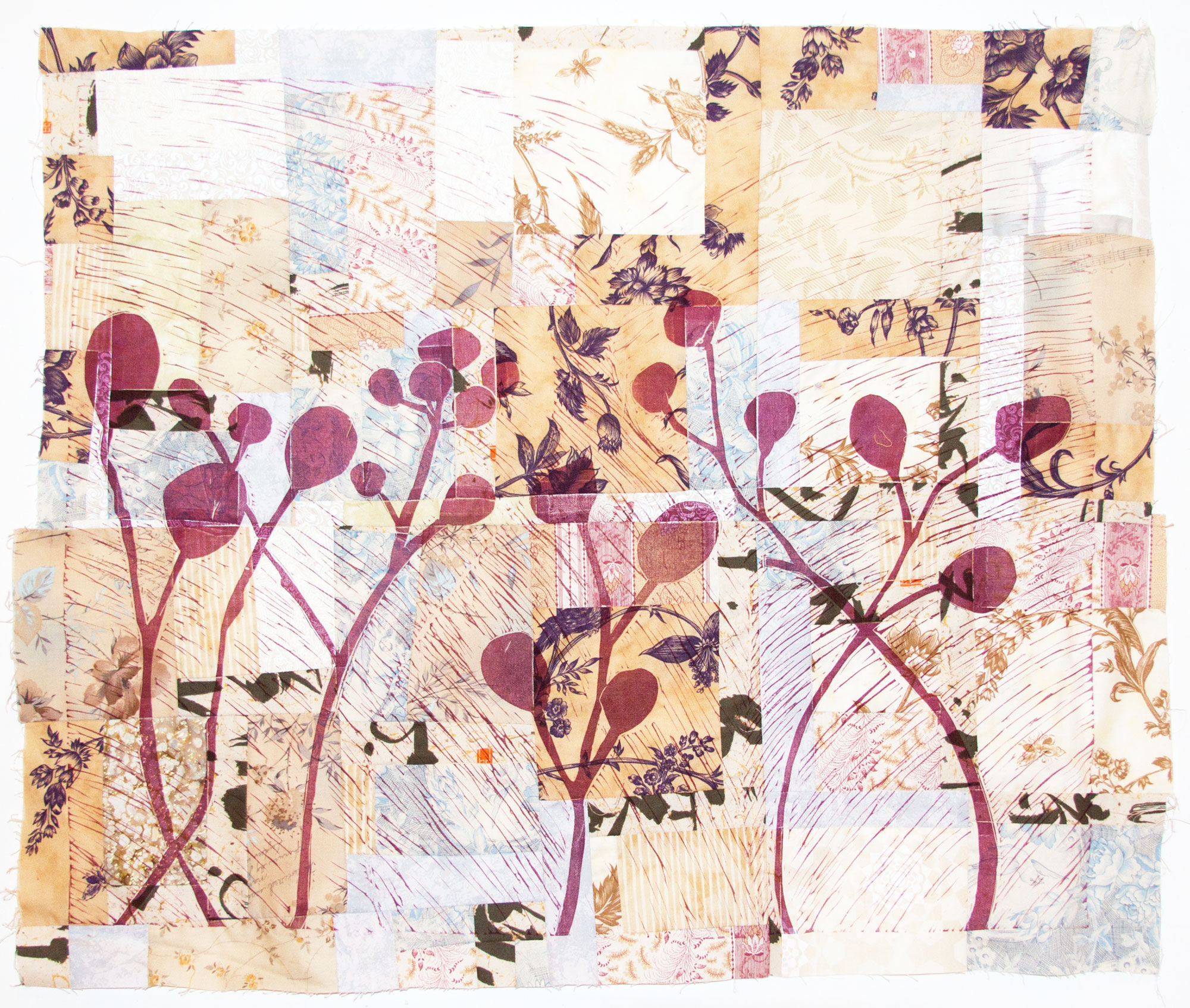 When Katie’s Luminous Linocuts class started up again a couple weeks ago, I decided to create a large print on a  background pieced from yellow and white scraps from a recent quilting retreat at Bishop’s Ranch in Healdsburg, CA.  I wanted the background to create a landscape feeling with a darker silhouette of plants in the foreground.  I considered appliquéing the silhouettes onto the background, but thought it might be fun to try printing it onto the fabric.  I drew the design onto a large 24″ x 20 piece of lino, dividing it into sections so it would be easier to ink up with a 12 inch roller.  Then I carved the lino for about a week.