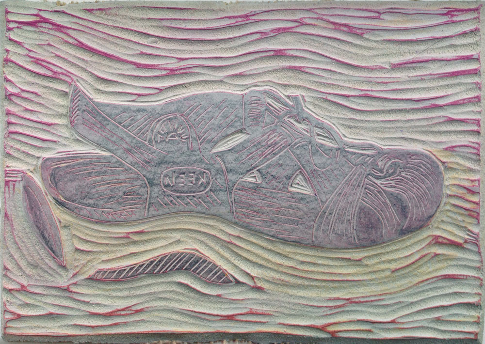 It was a busy week, and I didn’t have time to do any homework for my printmaking class. I usually do my carving at home, so I can spend most of my in-class time using the press. As I was getting ready to head over to the class at Chrysalis Studio in SF, I grabbed my supplies and was thinking of what I could do in class without too much effort. One of my goals for this session in Luminous Linocuts was to create a two plate lino cut print. I thought I would just have to draw “something” quickly in class and carve two plates. I suddenly remembered my sketchbook and thought that I must have a recent drawing that I could translate into a print. So I flipped through the sketchbook and decided to tackle this shoe drawing that I did earlier this month.