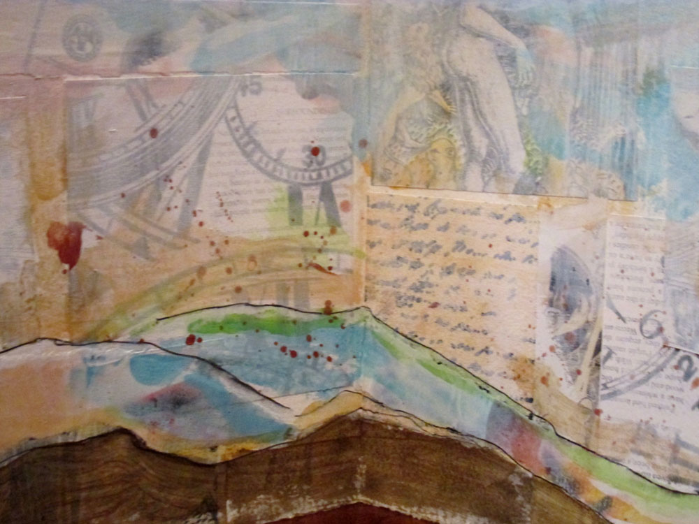 I started by gluing assorted black and white or other neutral papers  across the entire surface.  After the pages dried, I applied a couple layers of gesso with a brayer both to tone it all down, and to add texture. I added some torn pages from a magazine showing a woman wearing sunglasses. Stepping back at the resulting shapes, I decided to add layers of watercolor, acrylic and black Noodler’s Bulletproof ink to create a mountainous landscape.