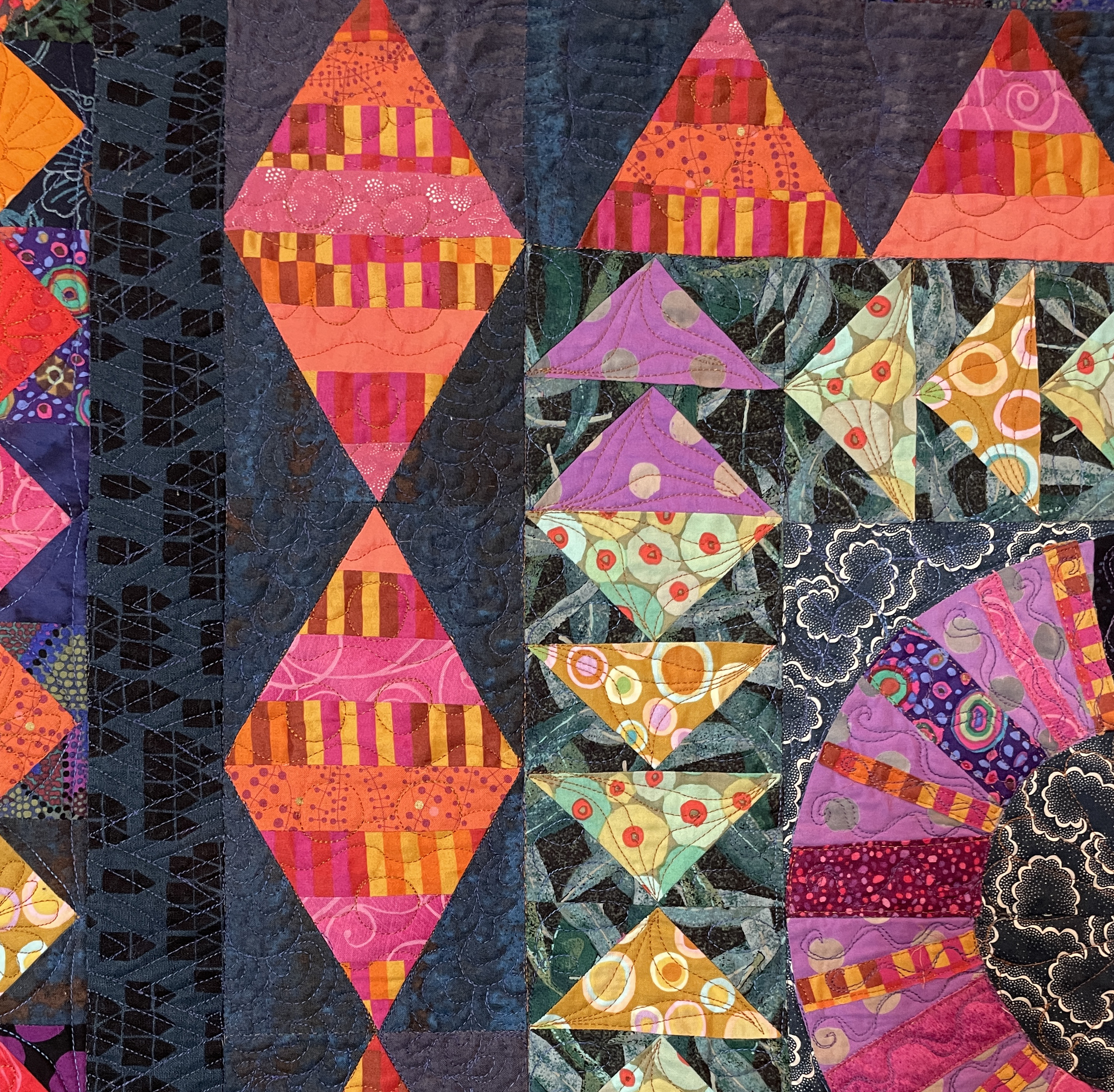 I started this quilt in 2020 with the EBHQ and SF Quilt Guilds’ Lone Robin challenge where quilters were given monthly parameters, starting with curves. We continued adding elements each month – flying geese, stripes, crosses, squares, finishing with “free choice”. This was a fun solo twist on the traditional round robin when we couldn’t meet in person or go to quilt shops.