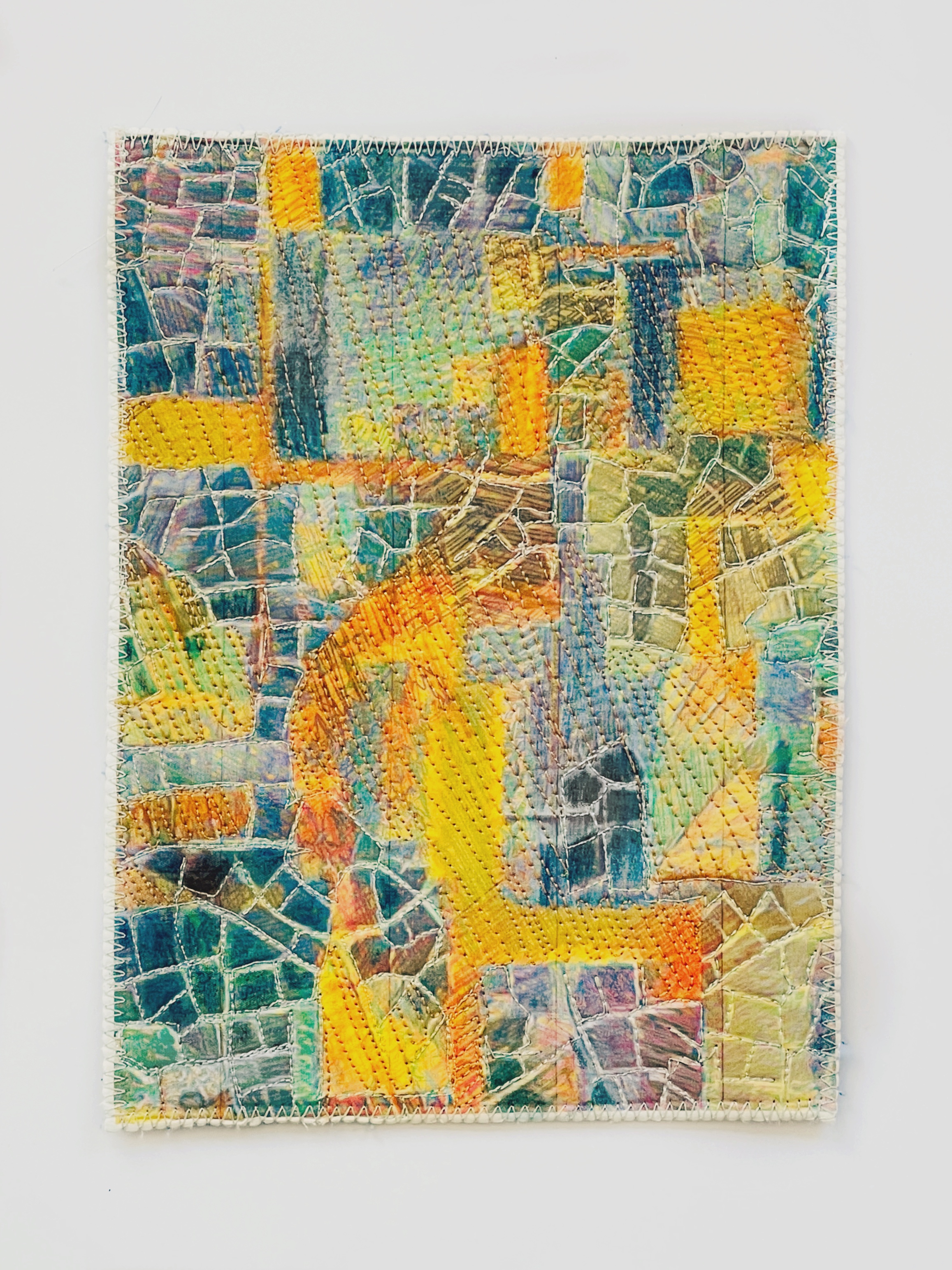 I was inspired by sunrises seen at a recent quilting retreat at the Bishop’s Ranch in Healdsburg, CA. I made this 6”x 8” quilted piece for the SAQA Spotlight Auction which will take place online during our 2022 Conference in late April.