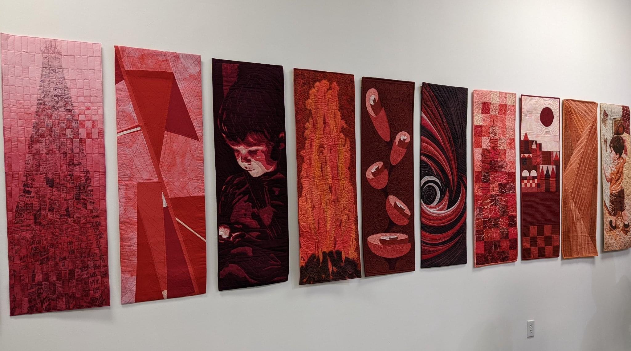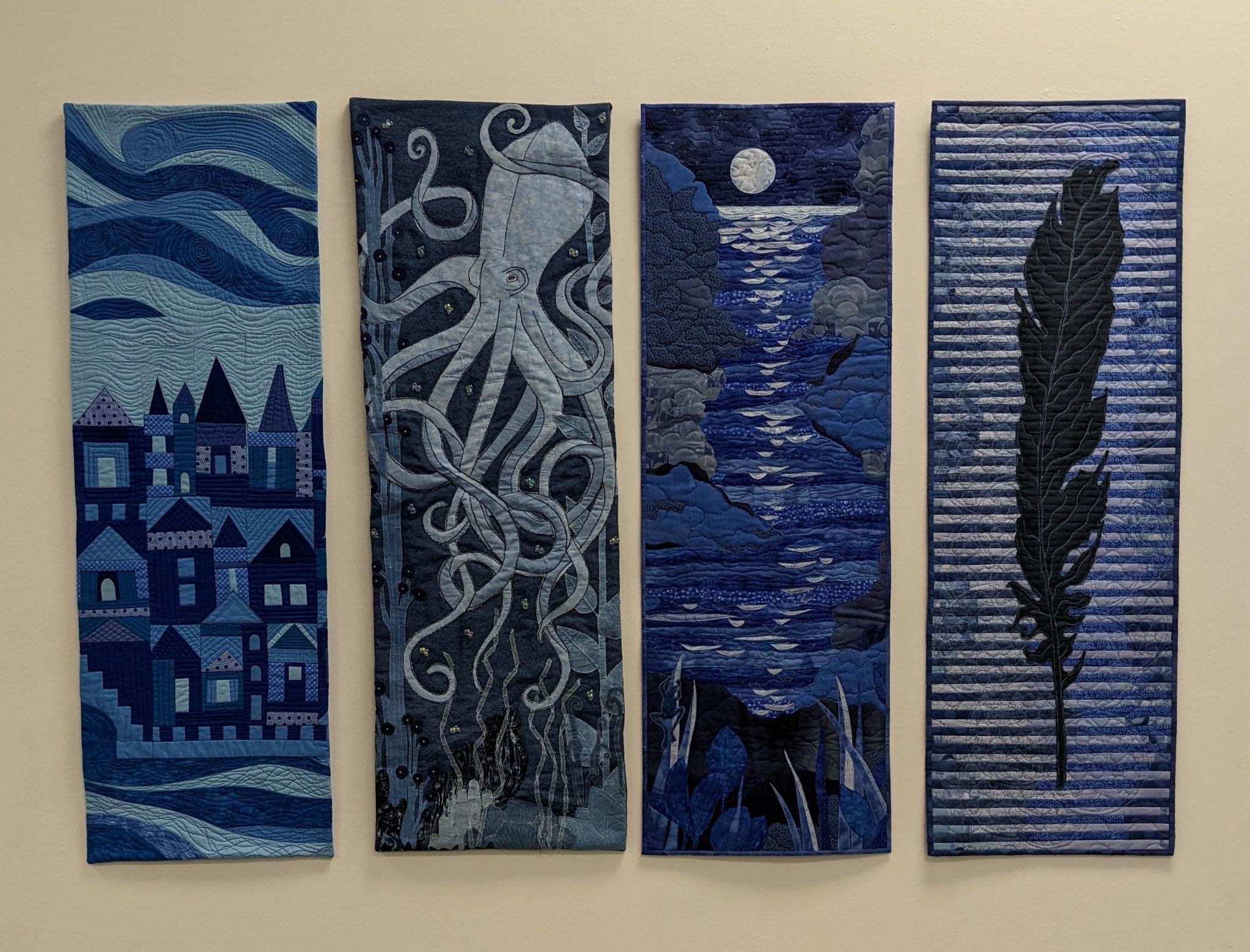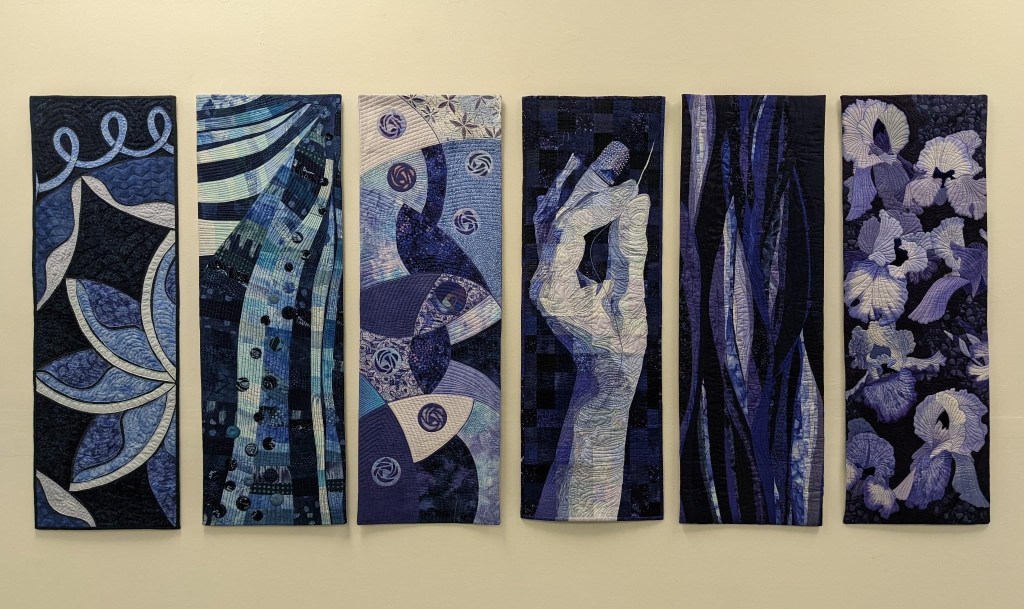 The opening and reception on Saturday, May 21, 2022 was a big success with 80 people attending. The Peninsula Museum of Art gallery, located at the The Shops at Tanforan, proved the perfect venue this show. The exhibition includes 62 art quilts representing the work of 46 SAQA Northern Californnia/Northern Nevada artists. The layout of the show allows visitors to view the spectrum of colors almost as if they were standing inside a prism. Two of my pieces, Blue Feather and Mandala Blue, were juried into the Prism Play exhibit. Read more about my pieces here.