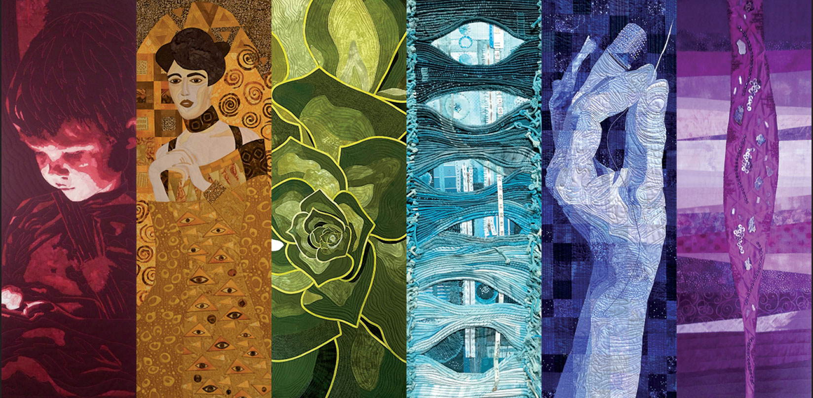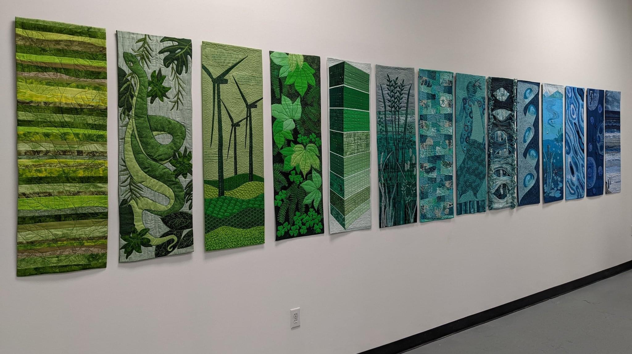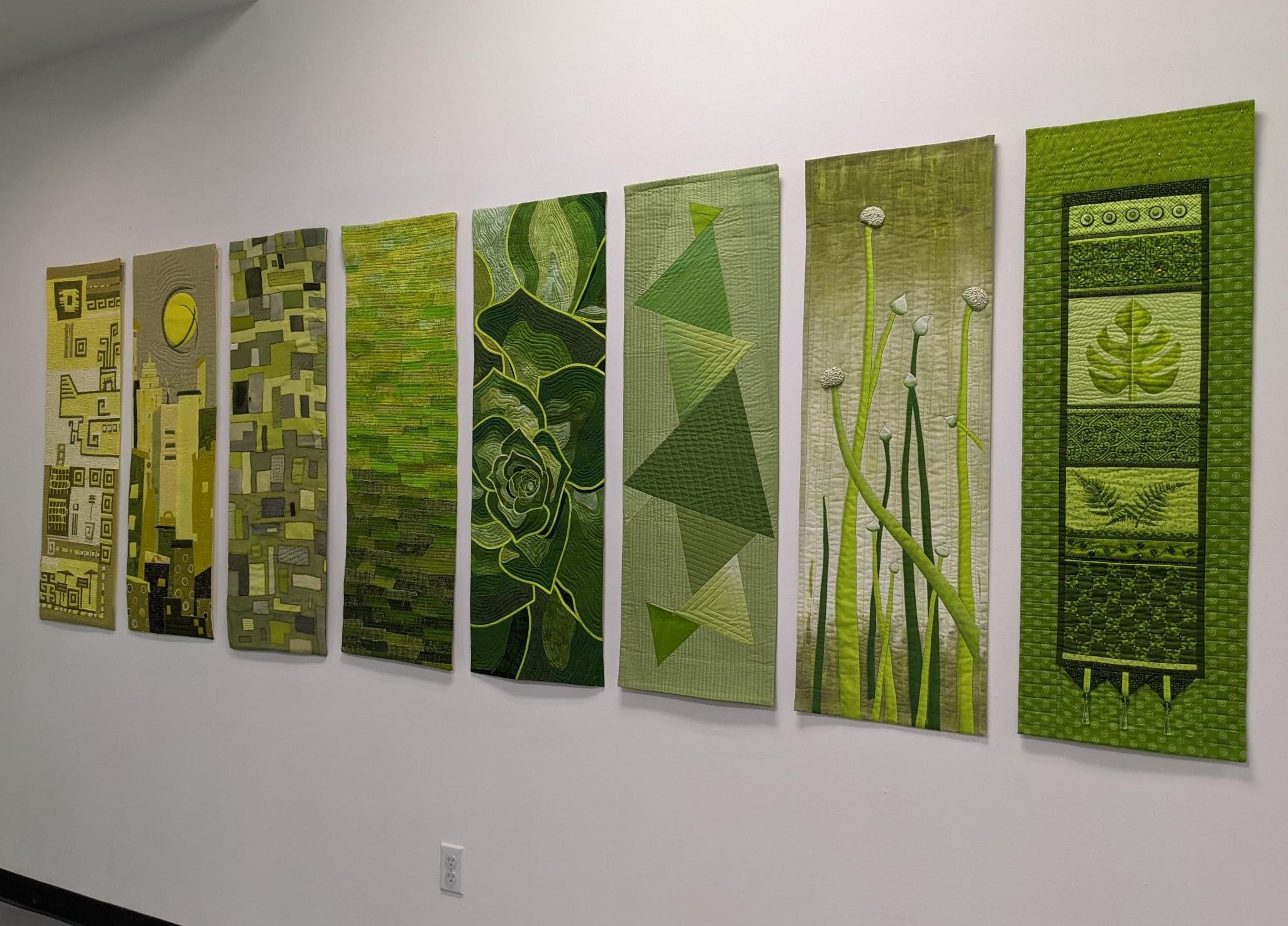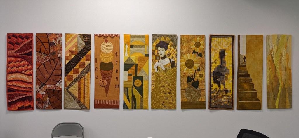 Working with the Joen Wolfrom color tool, participating artists submitted monochromatic work that, together, represent the full spectrum from cool yellow through green to blue, and on to violet, red, and orange, ending in warm yellow.