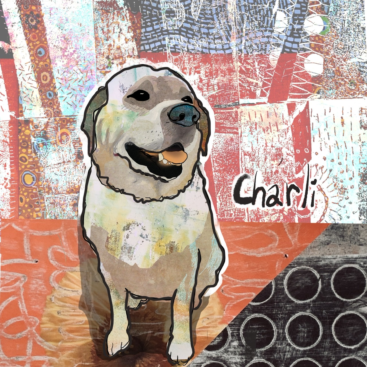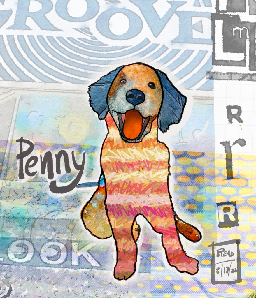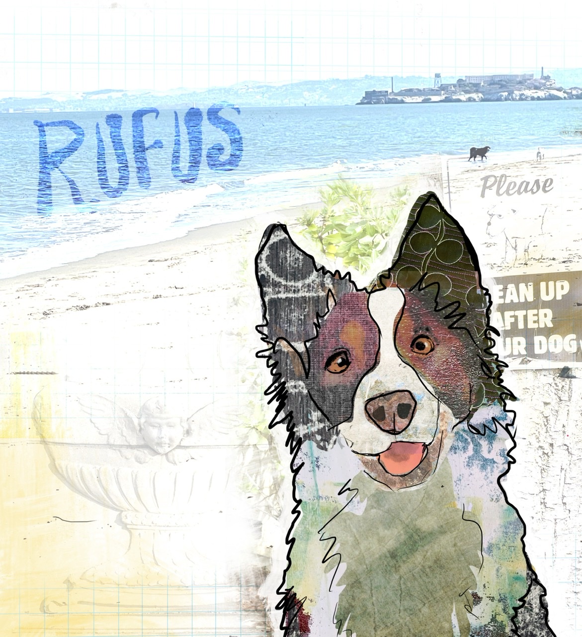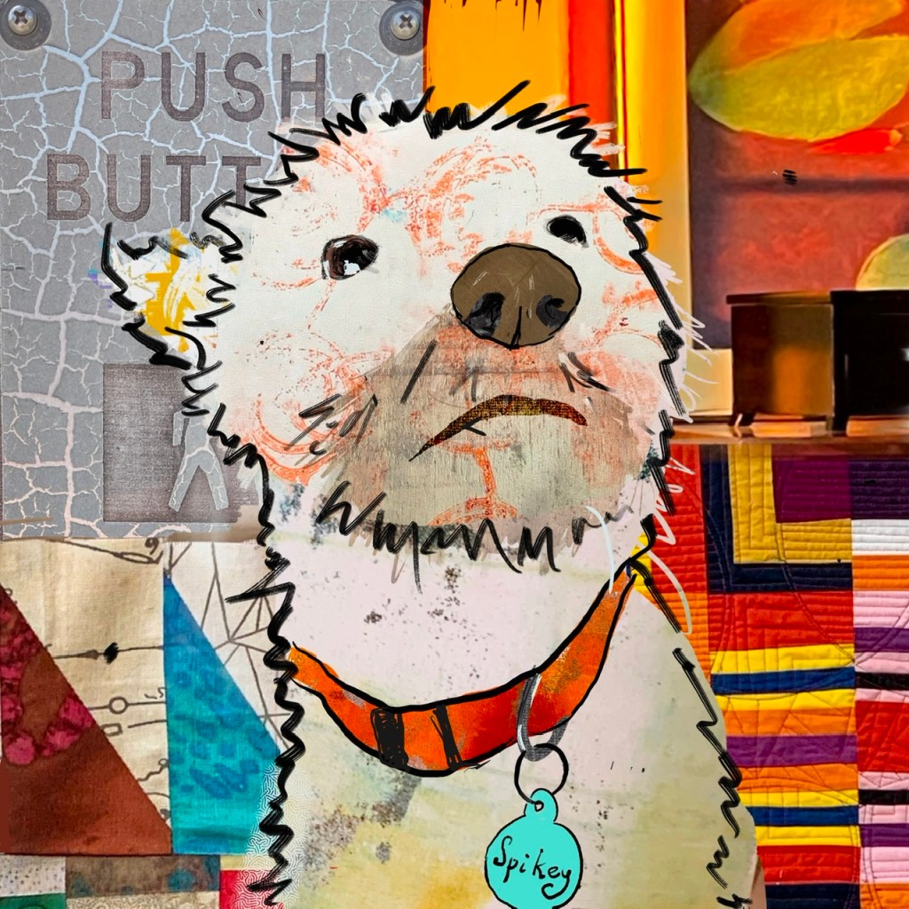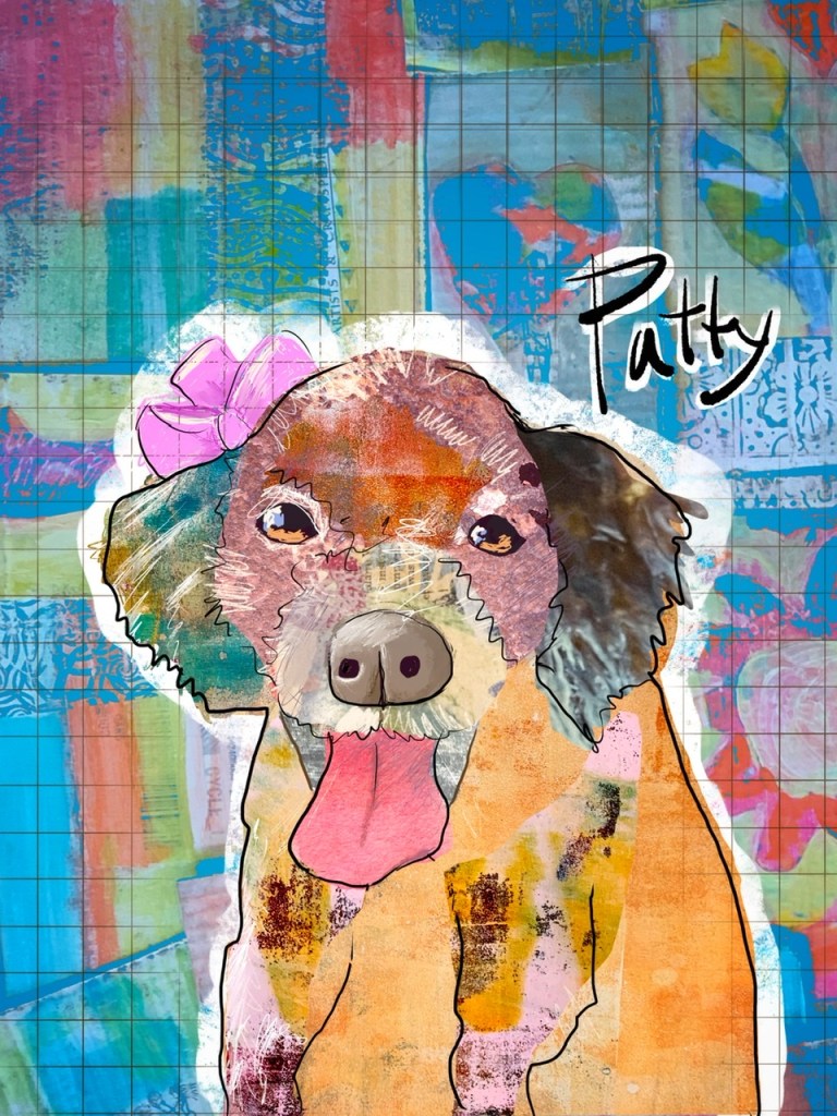 I recently took a Nicki FitzGerald’s online class Creative Pet Portraiture with Procreate and had a blast making digital collage portraits of my friends’ dogs. I’ve used Procreate to make collages before, but this class took it to a new level. I took more photos of text and textures and organized them into folders on my iPad. Nicki showed how to trace the dog photo and section off areas to fill with digital images. Each was created in a Procreate layer and sometimes further manipulated by changing the opacity or using filters.