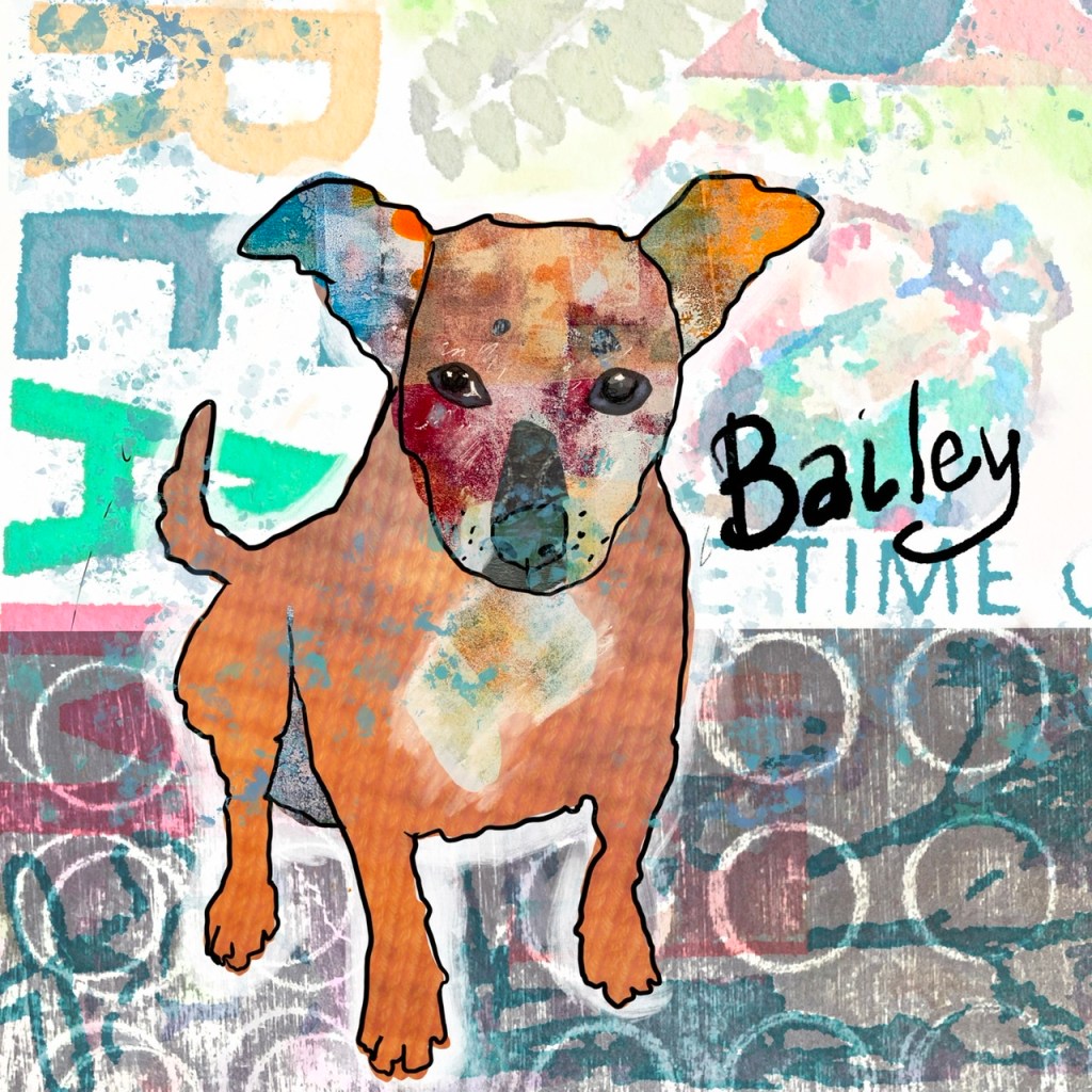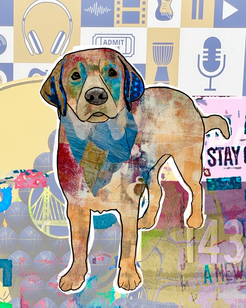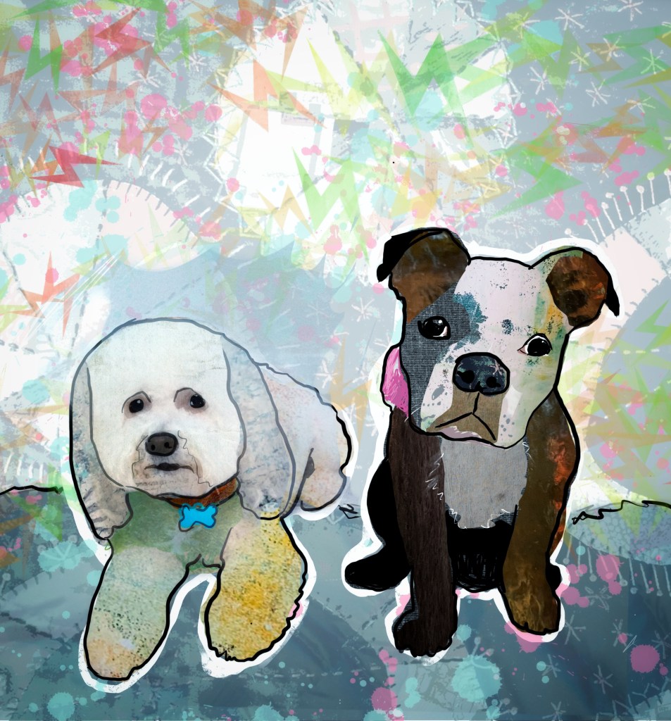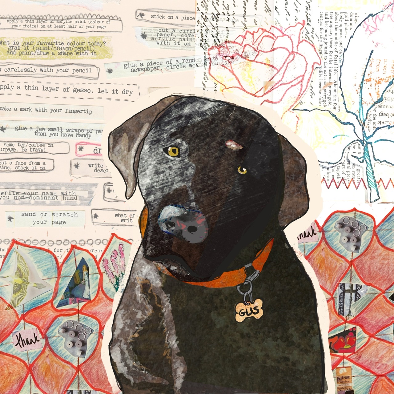 I recently took a Nicki FitzGerald’s online class Creative Pet Portraiture with Procreate and had a blast making digital collage portraits of my friends’ dogs. I’ve used Procreate to make collages before, but this class took it to a new level. I took more photos of text and textures and organized them into folders on my iPad. Nicki showed how to trace the dog photo and section off areas to fill with digital images. Each was created in a Procreate layer and sometimes further manipulated by changing the opacity or using filters.