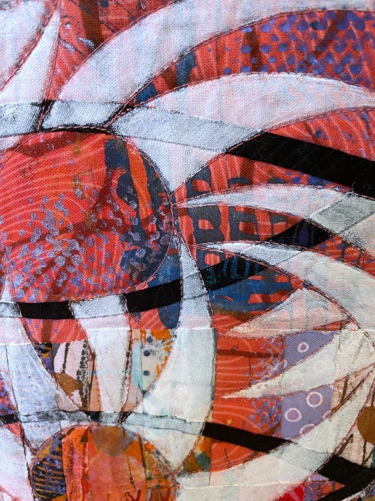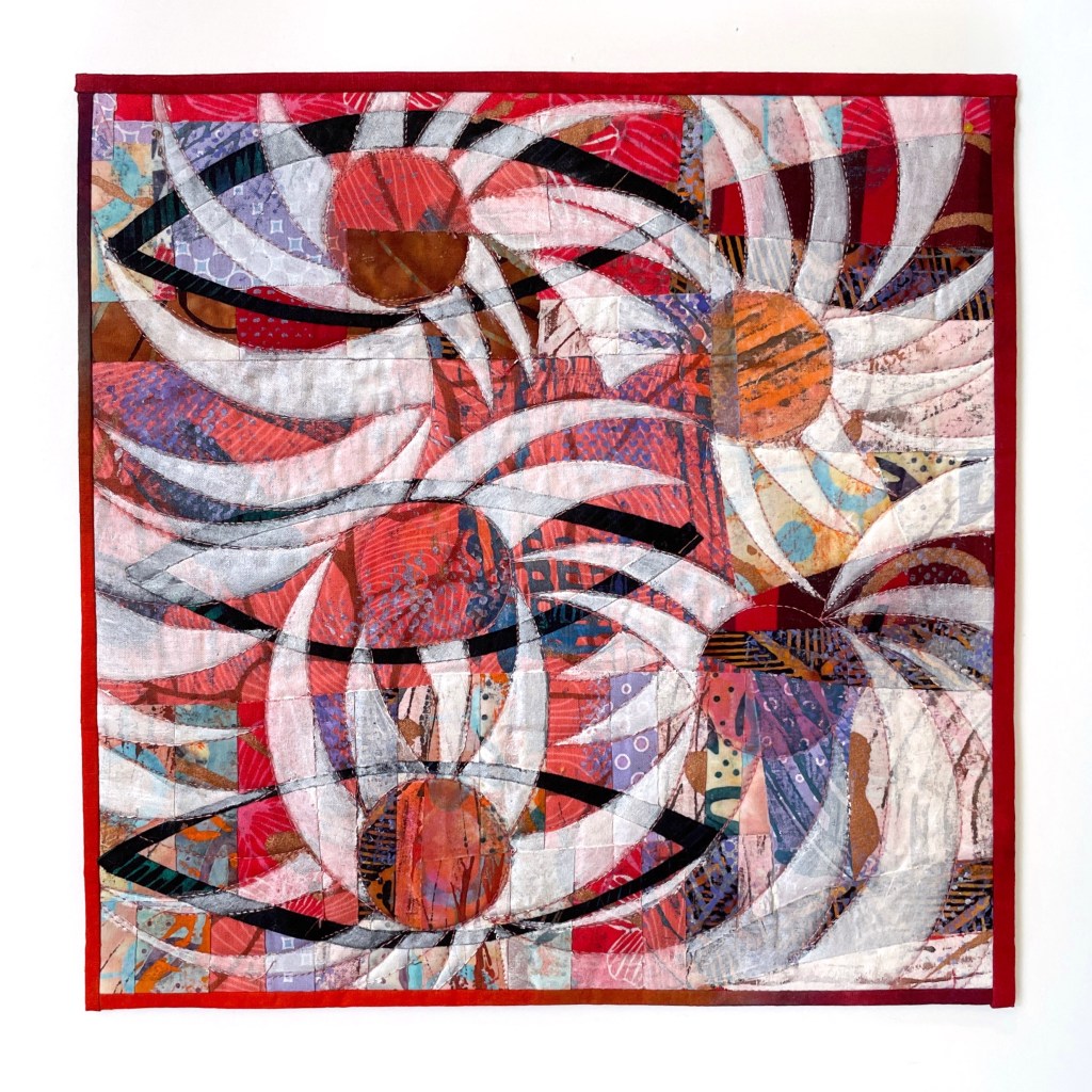 My 12”x 12” quilted piece, Swirling Suns 2, was juried into Printed & Stitched, a joint exhibition of the work by members of the California Society of Printmakers and Studio Art Quilt Associates, Northern and Southern California/Nevada Regions. The exhibition will open at Art Ark in San Jose on May 20, 2023. An artist reception at Art Ark is planned for June 2 to coincide with First Friday in San Jose. Closing date for the show at Art Ark is June 16th. The show will travel to other venues until July 2027.