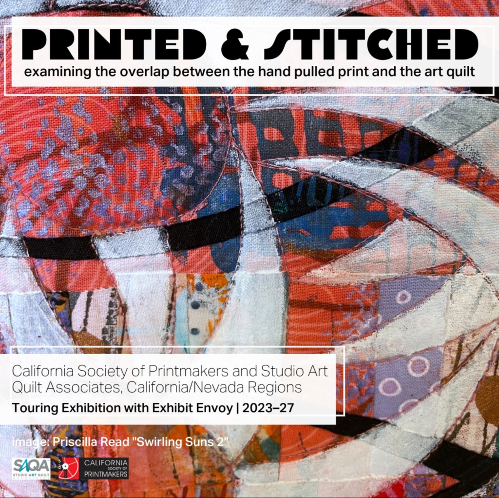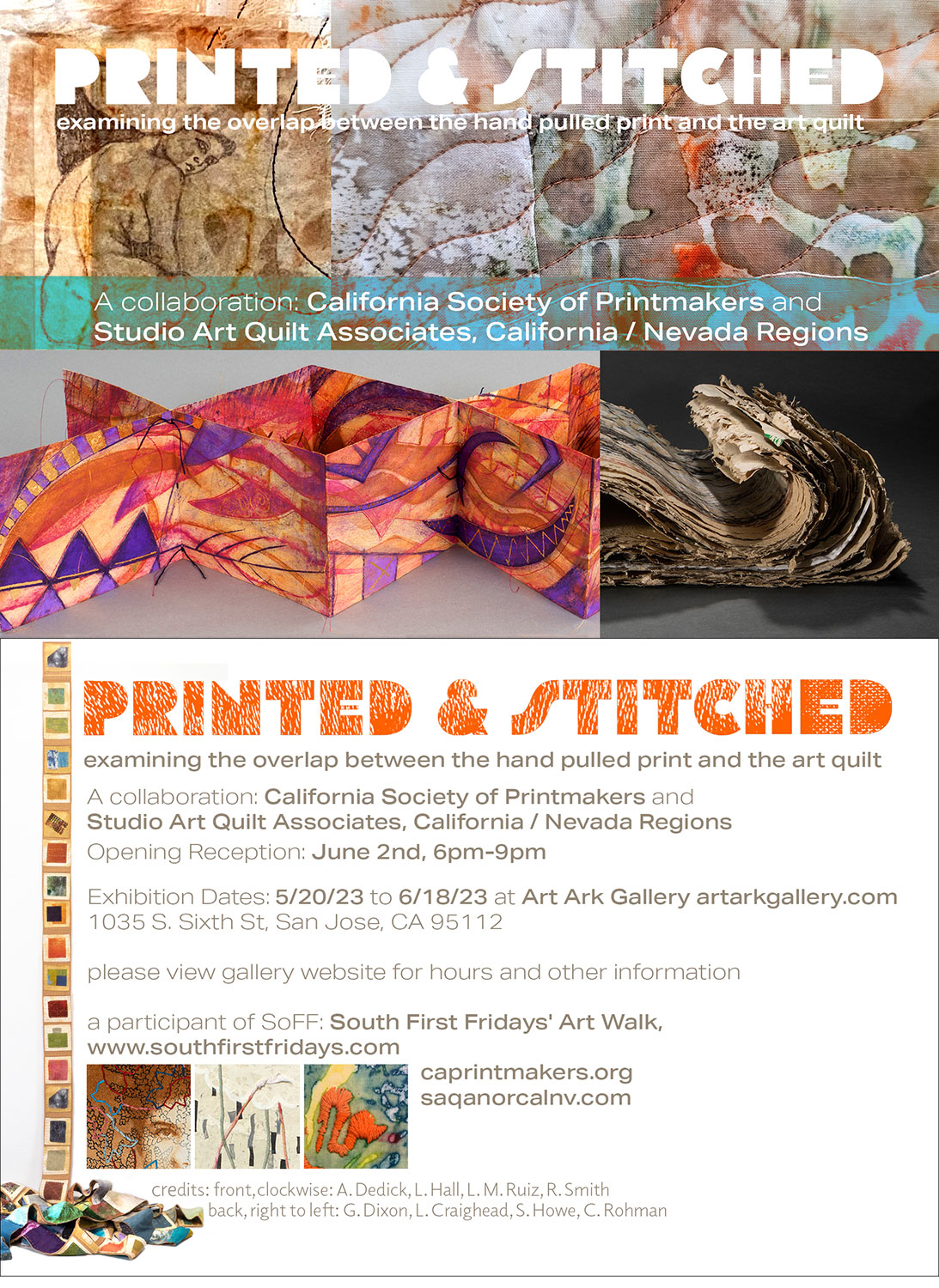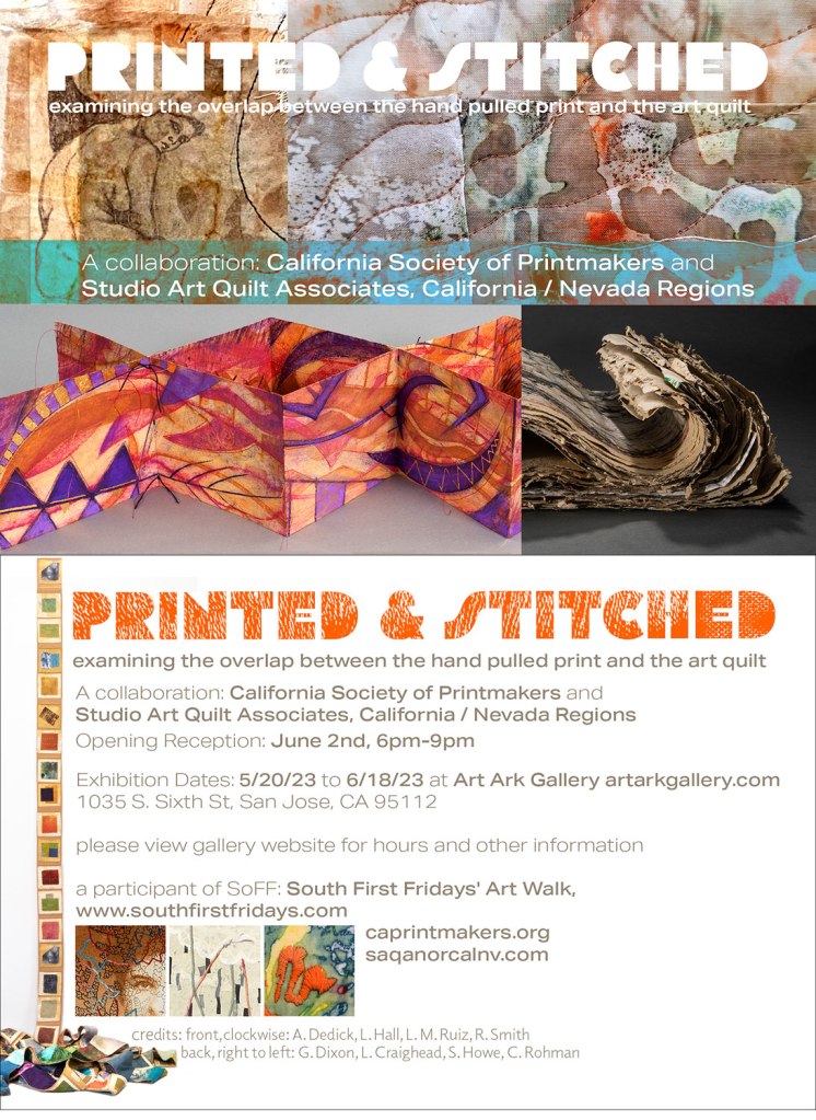 California Society of Printmakers and Studio Art Quilt Associates (SAQA) worked together to create an exhibit examining the overlap between the hand pulled print, and the art quilt. The first exhibition of Printed and Stitched will be from 5/20/23 to 6/18/23 at Art Ark Gallery artarkgallery.com,1035 S. Sixth St, San Jose, CA 95112