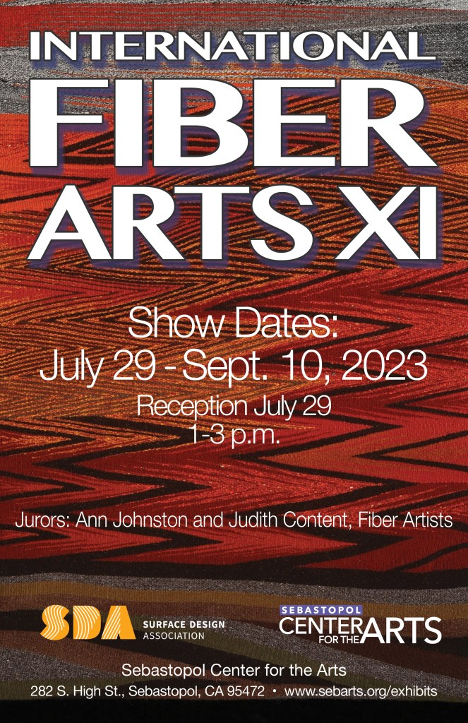 The 11th Biennial Fiber Art juried exhibition is held every two years at Sebastopol Center for the Arts (SCA). This show will be held in the SCA gallery and available virtually online on their website. The exhibition is co-sponsored by Sebastopol Center for the Arts and Surface Design Association.